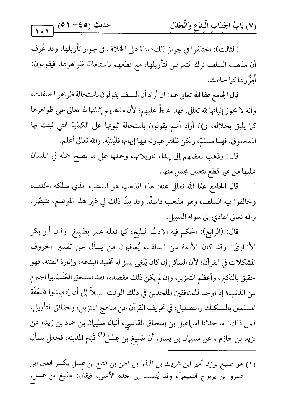 قال: (الرابع): الحكم فيه الأدبُ البليغ، كما فعله عمر بصَبِيغ. وقال أبو بكر الأنباريّ: وقد كان الأئمة من السلف، يُعاقبون من يَسأل عن تفسير الحروف المشكلات في القرآن؛ لأن السائل إن كان يَبْغِي بسؤاله تخليد البدعة، وإثارة الفتنة، فهو حقيق بالنكير، وأعظم التعزير، وإن لم يكن ذلك مقصده، فقد استحق العَتْبَ بما اجترم من الذنب؛ إذ أوجد للمنافقين الملحدين في ذلك الوقت سبيلًا إلى أن يَقصِدوا ضَعَفَة المسلمين بالتشكيك والتضليل، في تحريف القرآن عن مناهج التنزيل، وحقائق التأويل، فمن ذلك: ما حدثنا إسماعيل بن إسحاق القاضي، أنبأنا سليمان بن حماد بن زيد، عن يزيد بن حازم، عن سليمان بن يسار، أن صَبِيغ بن عِسْل (¬1) قَدِم المدينه، فجعل يسأل