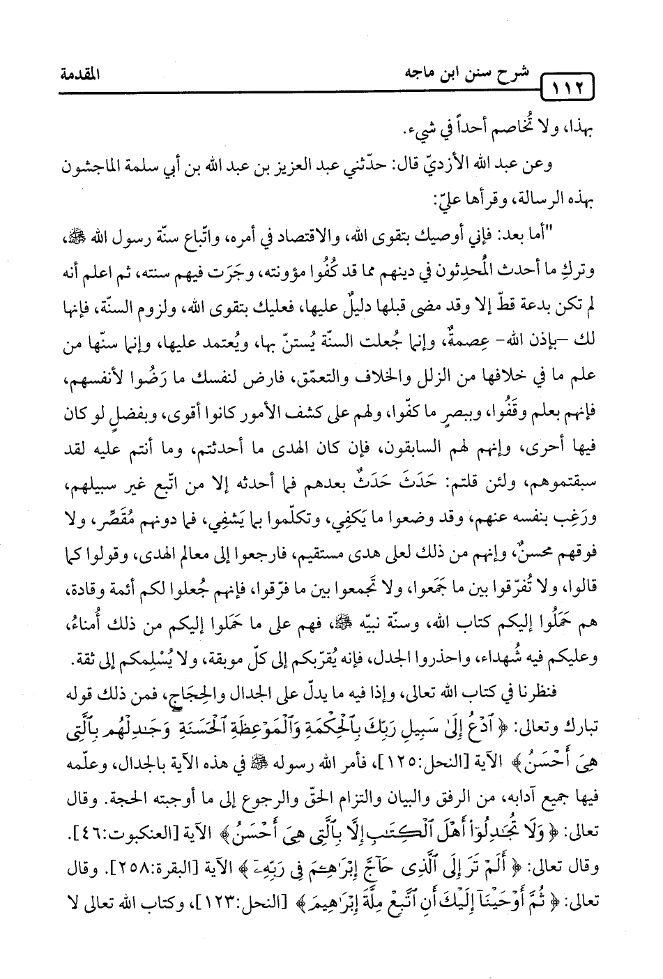 "أما بعد: فإني أوصيك بتقوى الله، والاقتصاد في أمره، واتّباع سنّة رسول الله -صلى الله عليه وسلم-، وتركِ ما أحدث المُحدِثون في دينهم مما قد كُفُوا مؤونته، وجَرَت فيهم سنته، ثم اعلم أنه لم تكن بدعة قطّ إلا وقد مضى قبلها دليلٌ عليها، فعليك بتقوى الله، ولزوم السنّة، فإنها لك -بإذن الله- عِصمةٌ، وإنما جُعلت السنّة يُستنّ بها، ويُعتمد عليها، وإنما سنّها من علم ما في خلافها من الزلل والخلاف والتعمّق، فارض لنفسك ما رَضُوا لأنفسهم، فإنهم بعلم وقَفُوا، وببصرٍ ما كفّوا، ولهم على كشف الأمور كانوا أقوى، وبفضلٍ لو كان فيها أحرى، وإنهم لهم السابقون، فإن كان الهدى ما أحدثتم، وما أنتم عليه لقد سبقتموهم، ولئن قلتم: حَدَثَ حَدَثٌ بعدهم فما أحدثه إلا من اتّبع غير سبيلهم، ورَغِب بنفسه عنهم، وقد وضعوا ما يَكفِي، وتكلّموا بما يَشفِي، فما دونهم مُقَصِّر، ولا فوقهم محسنٌ، وإنهم من ذلك لعلى هدى مستقيم، فارجعوا إلى معالم الهدى، وقولوا كما قالوا، ولا تُفرّقوا بين ما جَمَعوا، ولا تَجمعوا بين ما فرّقوا، فإنهم جُعلوا لكم أئمة وقادة، هم حَمَلُوا إليكم كتاب الله، وسنّة نبيّه -صلى الله عليه وسلم-، فهم على ما حَمَلوا إليكم من ذلك أُمناءُ، وعليكم فيه شُهداء، واحذروا الجدل، فإنه يُقرّبكم إلى كلّ موبقة، ولا يُسْلِمكم إلى ثقة.