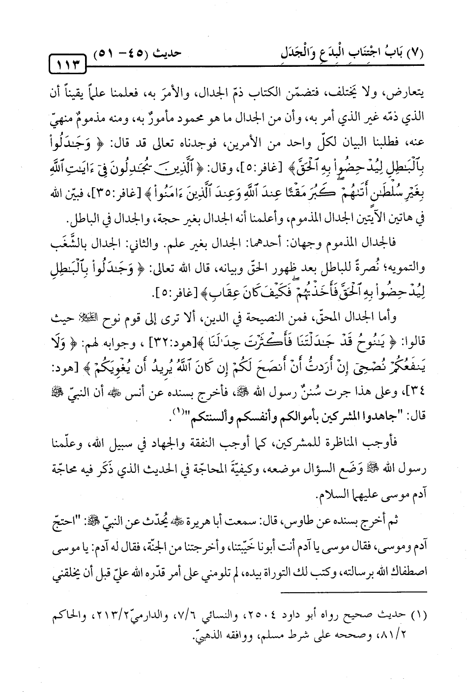 وأما الجدال المحقّ، فمن النصيحة في الدين، ألا ترى إلى قوم نوح عليه السلام حيث قالوا: {يَانُوحُ قَدْ جَادَلْتَنَا فَأَكْثَرْتَ جِدَالَنَا} [هود: 32]، وجوابه لهم: {وَلَا يَنْفَعُكُمْ نُصْحِي إِنْ أَرَدْتُ أَنْ أَنْصَحَ لَكُمْ إِنْ كَانَ اللَّهُ يُرِيدُ أَنْ يُغْوِيَكُمْ} [هود: 34]، وعلى هذا جرت سُننٌ رسول الله -صلى الله عليه وسلم-، فأخرج بسنده عن أنس -رضي الله عنه- أن النبيّ -صلى الله عليه وسلم- قال: "جاهدوا المشركين بأموالكم وأنفسكم وألسنتكم" (¬1).