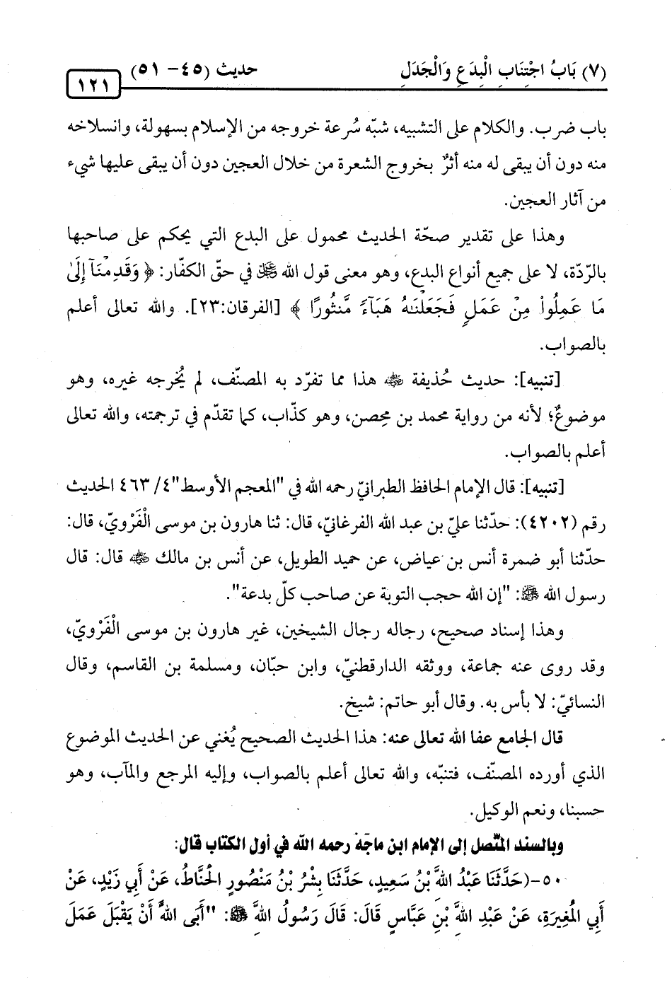 [تنبيه]: قال الإمام الحافظ الطبرانيّ رحمه الله في "المعجم الأوسط" 4/ 463 الحديث رقم (4202): حدّثنا عليّ بن عبد الله الفرغانيّ، قال: ثنا هارون بن موسى الْفَرْويّ، قال: حدّثنا أبو ضمرة أنس بن عياض، عن حميد الطويل، عن أنس بن مالك -رضي الله عنه- قال: قال رسول الله -صلى الله عليه وسلم-: "إن الله حجب التوبة عن صاحب كلّ بدعة".