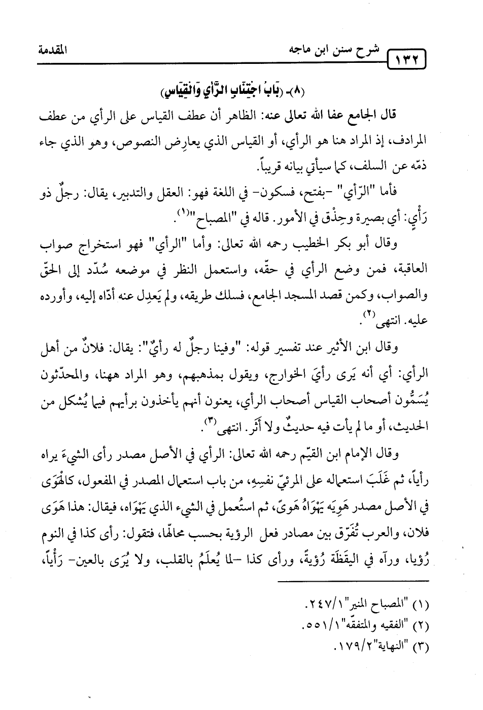 قال الجامع عفا الله تعالى عنه: الظاهر أن عطف القياس على الرأي من عطف المرادف، إذ المراد هنا هو الرأي، أو القياس الذي يعارِض النصوص، وهو الذي جاء ذمّه عن السلف، كما سيأتي بيانه قريبًا.