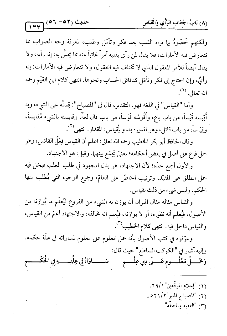 والقياس مثاله مثال الميزان أن يوزن به الشيء من الفروع ليُعلَم ما يُوازنه من الأصول، فيُعلم أنه نظيره، أو لا يوازنه، فيُعلم أنه مخالفه، والاجتهاد أعمّ من القياس، والقياس داخل فيه. انتهى كلام الخطيب (¬3).