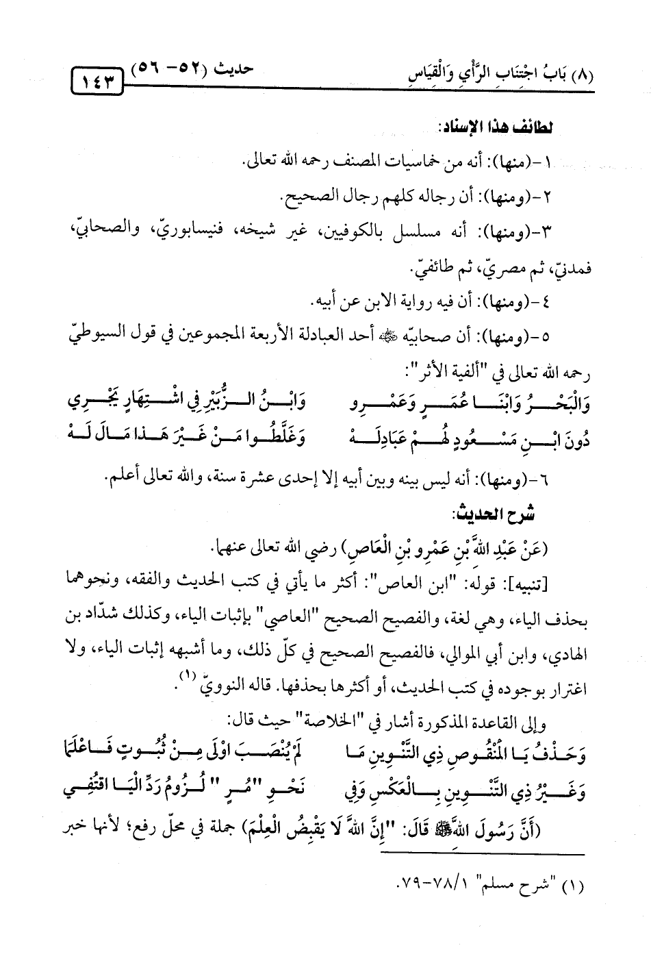 [تنبيه]: قوله: "ابن العاص": أكثر ما يأتي في كتب الحديث والفقه، ونحوهما بحذف الياء، وهي لغة، والفصيح الصحيح "العاصي" بإثبات الياء، وكذلك شدّاد بن الهادي، وابن أبي الموالي، فالفصيح الصحيح في كلّ ذلك، وما أشبهه إثبات الياء، ولا اغترار بوجوده في كتب الحديث، أو أكثرها بحذفها. قاله النوويّ (¬1).
