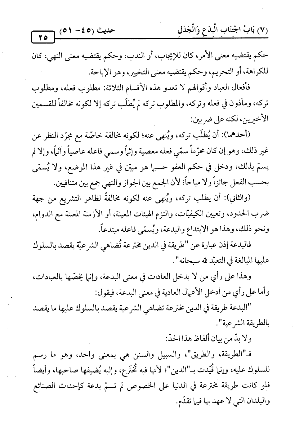 (والثاني): أن يطلب تركه، ويُنهى عنه لكونه مخالفةً لظاهر التشريع من جهة ضرب الحدود، وتعيين الكيفيّات، والتزم الهيئات المعينة، أو الأزمنة المعينة مع الدوام، ونحو ذلك، وهذا هو الابتداع والبدعة، ويُسمّى فاعله مبتدعًا.