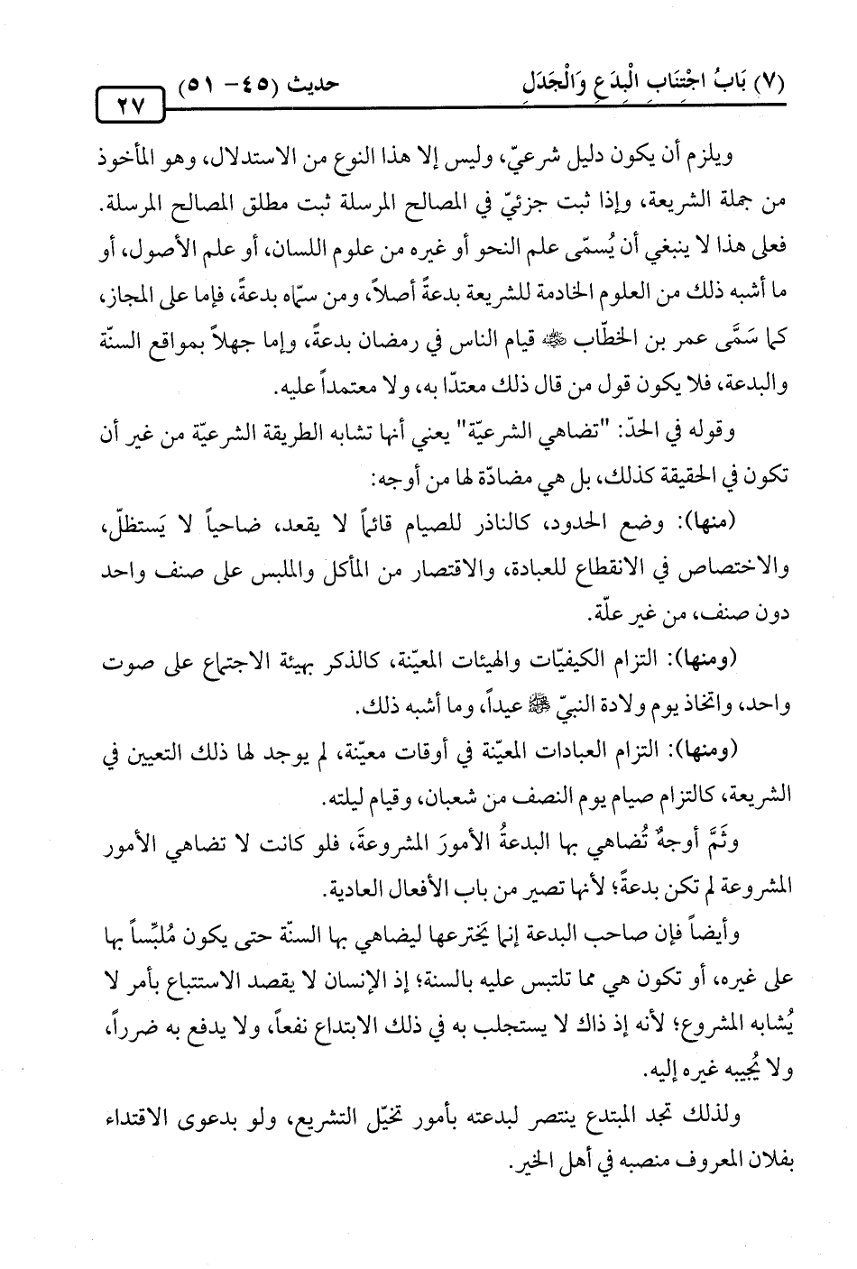 ويلزم أن يكون دليل شرعيّ، وليس إلا هذا النوع من الاستدلال، وهو المأخوذ من جملة الشريعة، وإذا ثبت جزئيّ في المصالح المرسلة ثبت مطلق المصالح المرسلة. فعلى هذا لا ينبغي أن يُسمّى علم النحو أو غيره من علوم اللسان، أو علم الأصول، أو ما أشبه ذلك من العلوم الخادمة للشريعة بدعةً أصلًا، ومن سمّاه بدعةً، فإما على المجاز، كما سَمَّى عمر بن الخطاب -رضي الله عنه- قيام الناس في رمضان بدعةً، وإما جهلًا بمواقع السنّة والبدعة، فلا يكون قول من قال ذلك معتدّا به، ولا معتمدًا عليه.