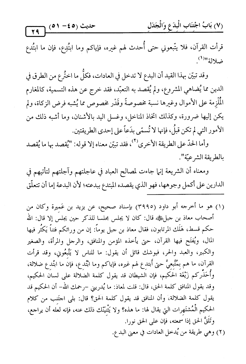 (¬1) هو ما أخرجه أبو داود (3995) بإسناد صحيح، عن يزيد بن عَمِيرة وكان من أصحاب معاذ بن جبل -رضي الله عنه- قال: كان لا يجلس مجلسا للذكار حين يجلس إلا قال: الله حكم قسط، هَلَك المرتابون، فقال معاذ بن جبل يومًا: إن من ورائكم فتنًا يَكثُر فيها المال، ويُفتَح فيها القرآن، حتى يأخذه المؤمن والمنافق، والرجل والمرأة، والصغير والكبير، والعبد والحر، فيوشك قائل أن يقول: ما للناس لا يَتَّبِعُوني، وقد قرأت القرآن، ما هم بِمُتَّبِعِيَّ حتى أَبتدع لهم غيره، فإياكم وما ابْتُدع، فإن ما ابتُدِع ضلالة، وأُحَذِّركم زَيْغَة الحكيم، فإن الشيطان قد يقول كلمة الضلالة على لسان الحكيم، وقد يقول المنافق كلمة الحق، قال: قلت لمعاذ: ما يُدريني -رحمك الله- أن الحكيم قد يقول كلمة الضلالة، وأن المنافق قد يقول كلمة الحق؟ قال: بلى اجتَنِب من كلام الحكيم الْمُشتَهِرات التي يقال لها: ما هذه؟ ولا يَثْنِيَنّك ذلك عنه، فإنه لعله أن يراجع، وتَلَقَّ الحق إذا سمعته، فإن على الحق نورا.