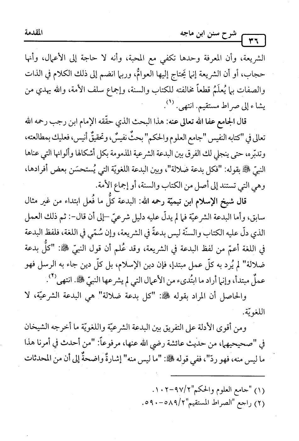 قال الجامع عفا الله تعالى عنه: هذا البحث الذي حقّقه الإمام ابن رجب رحمه الله تعالى في كتابه النفيس "جامع العلوم والحكم" بحثٌ نفيسٌ، وتحقيقٌ أنيس، فعليك بمطالعته، وتدبّره، حتى ينجلي لك الفرق بين البدعة الشرعية المذمومة بكل أشكالها وألوانها التي عناها النبيّ -صلى الله عليه وسلم- بقوله: "فكل بدعة ضلالة"، وبين البدعة اللغويّة التي يُستحسَن بعض أفرادها، وهي التي تستند إلى أصل من الكتاب والسنة، أو إجماع الأمة.