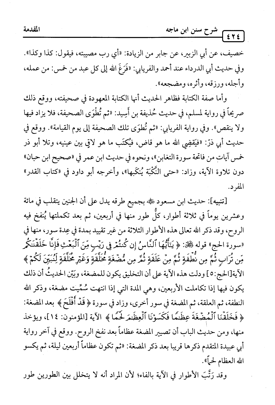 [تنبيه]: حديث ابن مسعود -رضي الله عنه- بجميع طرقه يدل على أن الجنين يتقلب في مائة وعشرين يومًا في ثلاثة أطوار، كلُّ طور منها في أربعين، ثم بعد تكملتها يُنفخ فيه الروح، وقد ذكر الله تعالى هذه الأطوار الثلاثة من غير تقييد بمدة في عِدة سور، منها في "سورة الحج" قوله عز وجل: {يَاأَيُّهَا النَّاسُ إِنْ كُنْتُمْ في رَيْبٍ مِنَ الْبَعْثِ فَإِنَّا خَلَقْنَاكُمْ مِنْ تُرَابٍ ثُمَّ مِنْ نُطْفَةٍ ثُمَّ مِنْ عَلَقَةٍ ثُمَّ مِنْ مُضْغَةٍ مُخَلَّقَةٍ وَغَيْرِ مُخَلَّقَةٍ لِنُبَيِّنَ لَكُمْ} الآية [الحج: 5] ودلت هذه الآية على أن التخليق يكون للمضغة، وبَيّن الحديثُ أن ذلك يكون فيها إذا تكاملت الأربعين، وهي المدة التي إذا انتهت سُمِّيت مضغة، وذكر الله النطفة، ثم العلقة، ثم المضغة في سور أخرى، وزاد في سورة {قَدْ أَفْلَحَ} بعد المضغة: {فَخَلَقْنَا الْمُضْغَةَ عِظَامًا فَكَسَوْنَا الْعِظَامَ لَحْمًا} الآية [المؤمنون: 14]، ويؤخذ منها، ومن حديث الباب أن تصيير المضغة عظامًا بعد نفخ الروح. ووقع في آخر رواية أبي عبيدة المتقدم ذكرها قريبا بعد ذكر المضغة: "ثم تكون عظامًا أربعين ليلة، ثم يكسو الله العظام لحمًا".
