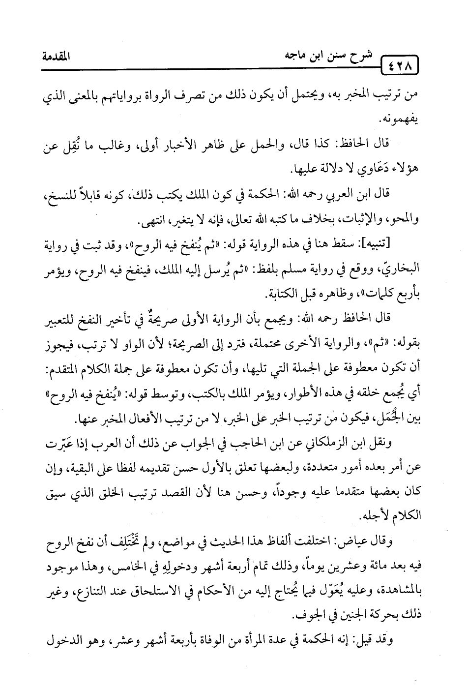 وقال عياض: اختلفت ألفاظ هذا الحديث في مواضع، ولم تَخْتَلِف أن نفخ الروح فيه بعد مائة وعشرين يومًا، وذلك تمام أربعة أشهر ودخولِهِ في الخامس، وهذا موجود بالمشاهدة، وعليه يُعَوّل فيما يُحتاج إليه من الأحكام في الاستلحاق عند التنازع، وغير ذلك بحركة الجنين في الجوف.