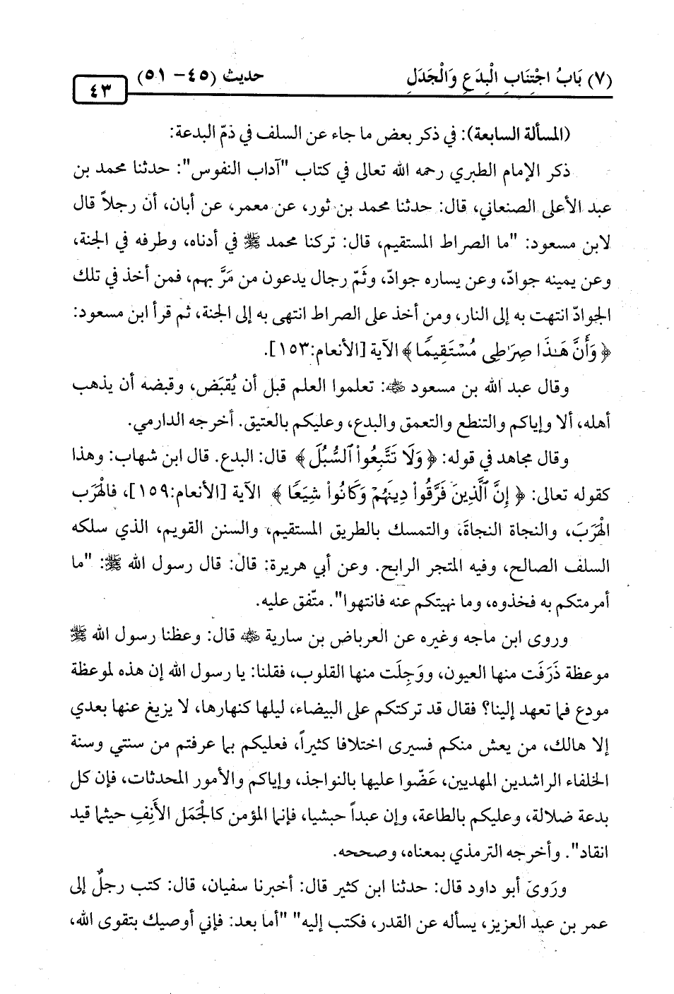 ذكر الإمام الطبري رحمه الله تعالى في كتاب "آداب النفوس": حدثنا محمد بن عبد الأعلى الصنعاني، قال: حدثنا محمد بن ثور، عن معمر، عن أبان، أن رجلًا قال لابن مسعود: "ما الصراط المستقيم، قال: تركنا محمد -صلى الله عليه وسلم- في أدناه، وطرفه في الجنة، وعن يمينه جوادّ، وعن يساره جوادّ، وثَمّ رجال يدعون من مَرَّ بهم، فمن أخذ في تلك الجوادّ انتهت به إلى النار، ومن أخذ على الصراط انتهى به إلى الجنة، ثم قرأ ابن مسعود: {وَأَنَّ هَذَا صِرَاطِي مُسْتَقِيمًا} الآية [الأنعام: 153].