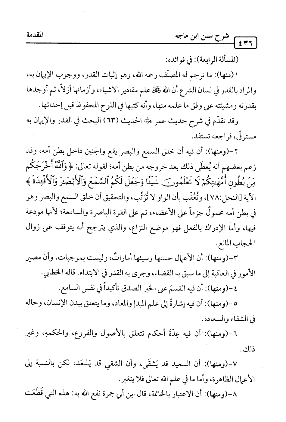 1 - (منها): ما ترجم له المصنّف رحمه الله، وهو إثبات القدر، ووجوب الإيمان به، والمراد بالقدر في لسان الشرع أن الله عز وجل علم مقادير الأشياء، وأزمانها أزلًا، ثم أوجدها بقدرته ومشيئته على وفق ما علمه منها، وأنه كتبها في اللوح المحفوظ قبل إحداثها.