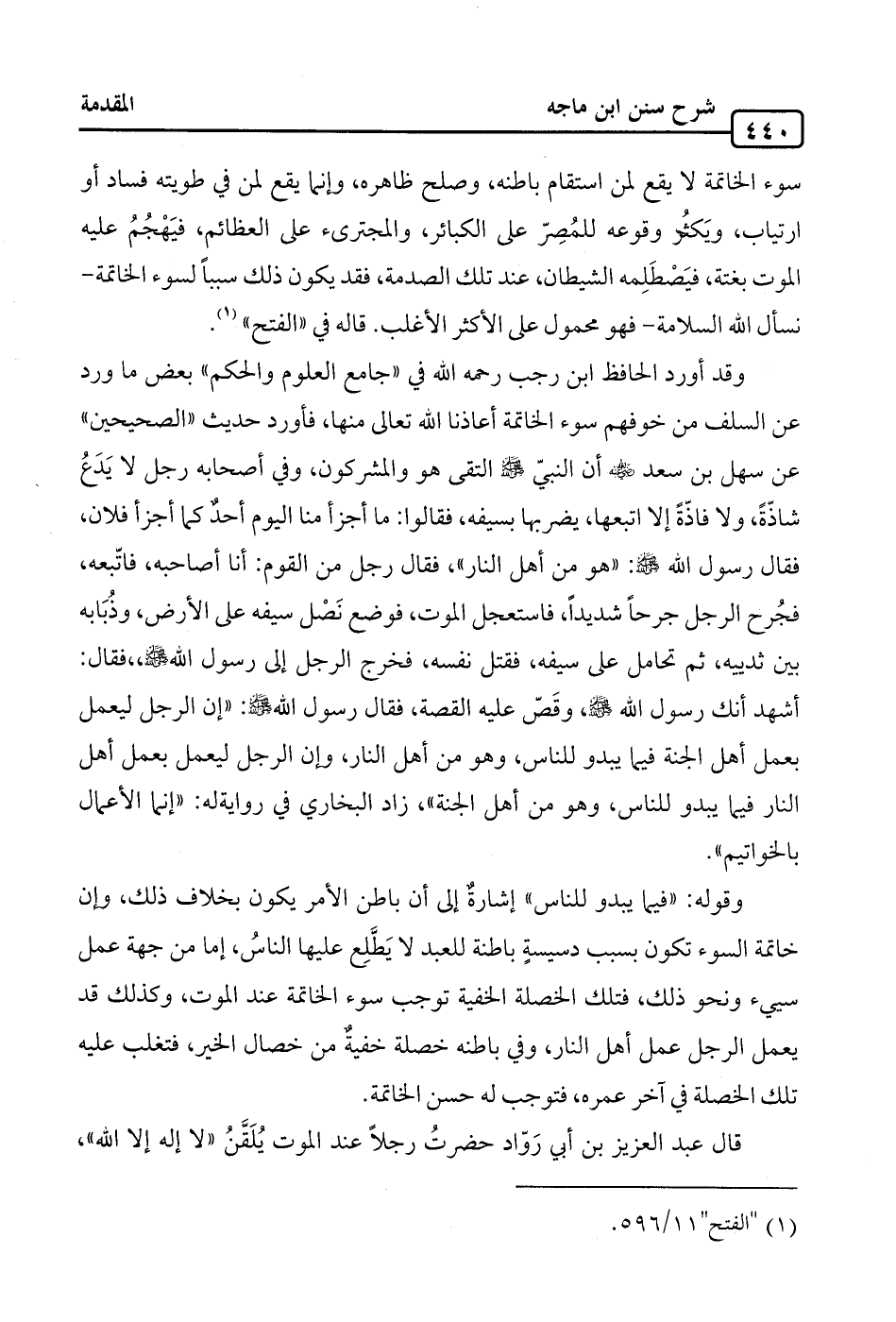 وقد أورد الحافظ ابن رجب رحمه الله في "جامع العلوم والحكم" بعض ما ورد عن السلف من خوفهم سوء الخاتمة أعاذنا الله تعالى منها، فأورد حديث "الصحيحين" عن سهل بن سعد -رضي الله عنه- أن النبيّ -رضي الله عنه- التقى هو والمشركون، وفي أصحابه رجل لا يَدَعُ شاذّةً، ولا فاذّةً إلا اتبعها، يضربها بسيفه، فقالوا: ما أجزأ منا اليوم أحدٌ كما أجزأ فلان، فقال رسول الله -صلى الله عليه وسلم-: "هو من أهل النار"، فقال رجل من القوم: أنا أصاحبه، فاتّبعه، فجُرح الرجل جرحًا شديدًا، فاستعجل الموت، فوضع نَصْل سيفه على الأرض، وذُبَابه بين ثدييه، ثم تحامل على سيفه، فقتل نفسه، فخرج الرجل إلى رسول الله -صلى الله عليه وسلم-،، فقال: أشهد أنك رسول الله -صلى الله عليه وسلم-، وقَصّ عليه القصة، فقال رسول الله -صلى الله عليه وسلم-: "إن الرجل ليعمل بعمل أهل الجنة فيما يبدو للناس، وهو من أهل النار، وإن الرجل ليعمل بعمل أهل النار فيما يبدو للناس، وهو من أهل الجنة"، زاد البخاري في رواية له: "إنما الأعمال بالخواتيم".