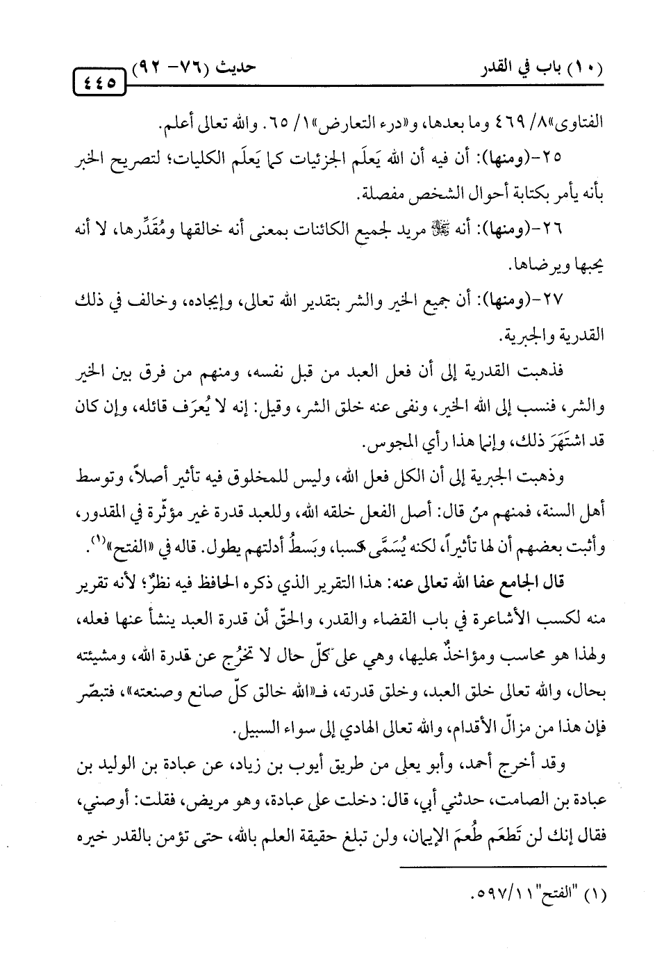 قال الجامع عفا الله تعالى عنه: هذا التقرير الذي ذكره الحافظ فيه نظرٌ؛ لأنه تقرير منه لكسب الأشاعرة في باب القضاء والقدر، والحقّ أن قدرة العبد ينشأ عنها فعله، ولهذا هو محاسب ومؤاخذٌ عليها، وهي على كلّ حال لا تخرُج عن قدرة الله، ومشيئته بحال، والله تعالى خلق العبد، وخلق قدرته، فـ "الله خالق كلّ صانع وصنعته"، فتبصّر فإن هذا من مزالّ الأقدام، والله تعالى الهادي إلى سواء السبيل.