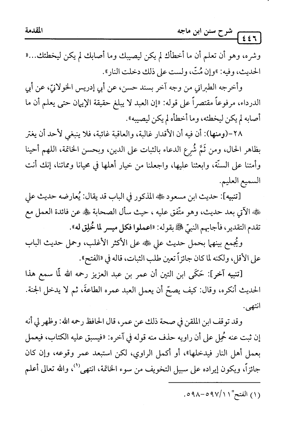 [تنبيه]: حديث ابن مسعود -رضي الله عنه- المذكور في الباب قد يقال: يُعارضه حديث علي -رضي الله عنه- الآتي بعد حديث، وهو متّفقٌ عليه، حيث سأل الصحابة -رضي الله عنهم- عن فائدة العمل مع تقدم التقدير، فأجابهم النبيّ -صلى الله عليه وسلم- بقوله: "اعملوا فكل ميسر لما خُلِق له".