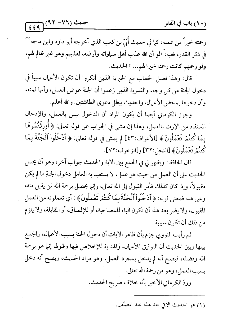 قال: وهذا فصل الخطاب مع الجبرية الذين أنكروا أن تكون الأعمال سببًا في دخول الجنة من كل وجه، والقدرية الذين زعموا أن الجنة عوض العمل، وأنها ثمنه، وأن دخولها بمحض الأعمال، والحديث يبطل دعوى الطائفتين. والله أعلم.