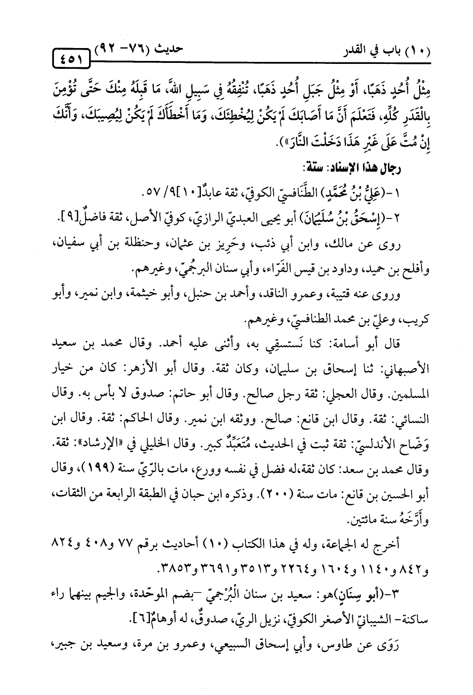 مِثْلُ أُحُدٍ ذَهَبًا، أَوْ مِثْلُ جَبَلِ أُحُدٍ ذَهَبًا، تُنْفِقُهُ في سَبِيلِ اللَّه، مَا قَبِلَهُ مِنْكَ حَتَّى تُؤْمِنَ بِالْقَدَرِ كُلِّهِ، فَتَعْلَمَ أَنَّ مَا أَصَابَكَ لَمْ يَكُنْ لِيُخْطِئَكَ، وَمَا أَخْطَأَكَ لَمْ يَكُنْ لِيُصِيبَكَ، وَأَنَّكَ إِنْ مُتَّ عَلَى غَيْرِ هَذَا دَخَلْتَ النَّارَ").