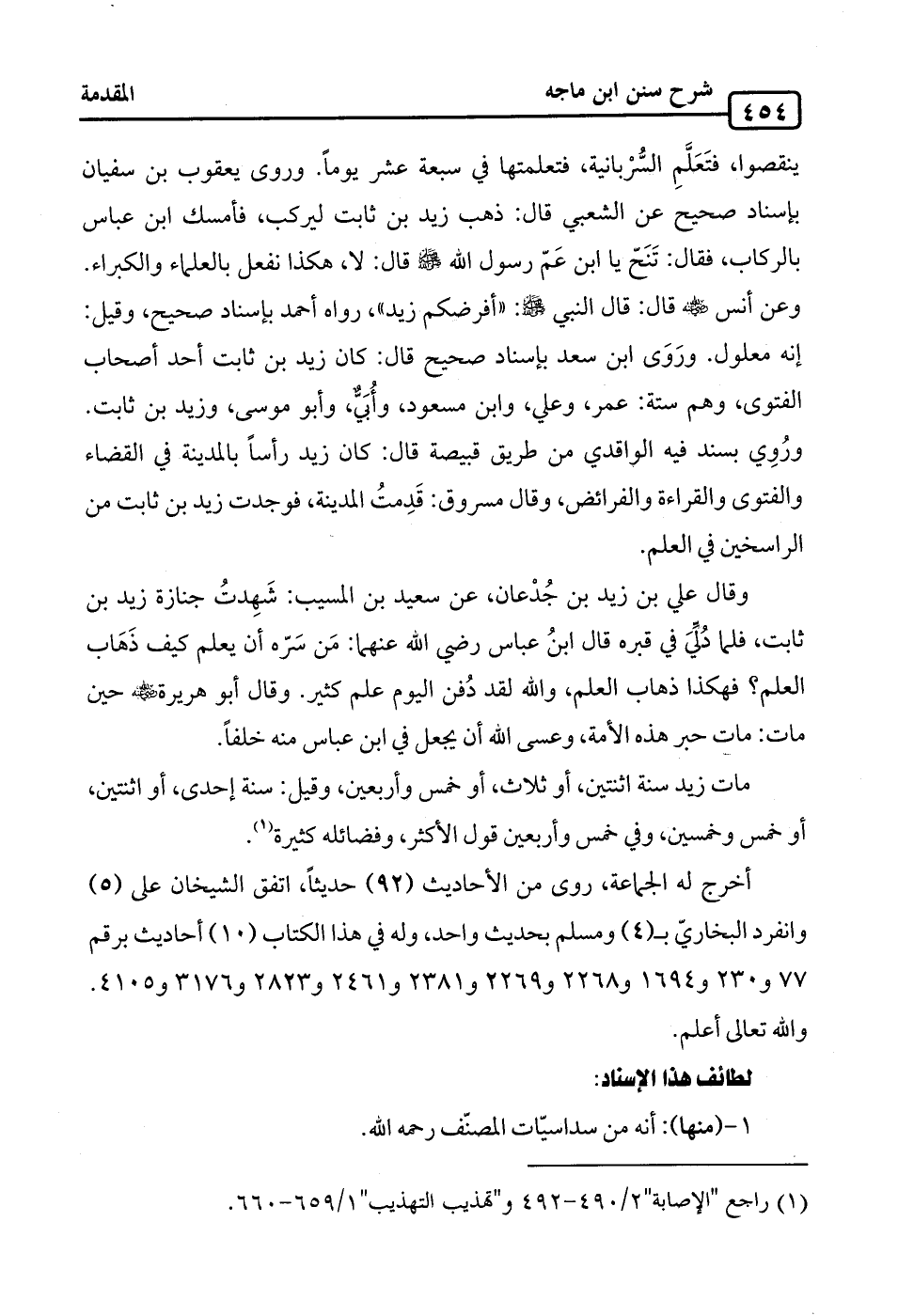 ينقصوا، فتَعَلَّمِ السُّرْبانية، فتعلمتها في سبعة عشر يومًا. وروى يعقوب بن سفيان بإسناد صحيح عن الشعبي قال: ذهب زيد بن ثابت ليركب، فأمسك ابن عباس بالركاب، فقال: تَنَحّ يا ابن عَمّ رسول الله -صلى الله عليه وسلم- قال: لا، هكذا نفعل بالعلماء والكبراء. وعن أنس -رضي الله عنه- قال: قال النبي -صلى الله عليه وسلم-: "أفرضكم زيد"، رواه أحمد بإسناد صحيح، وقيل: إنه معلول. ورَوَى ابن سعد بإسناد صحيح قال: كان زيد بن ثابت أحد أصحاب الفتوى، وهم ستة: عمر، وعلي، وابن مسعود، وأُبَيٌّ، وأبو موسى، وزيد بن ثابت. ورُوِي بسند فيه الواقدي من طريق قبيصة قال: كان زيد رأسًا بالمدينة في القضاء والفتوى والقراءة والفرائض، وقال مسروق: قَدِمتُ المدينة، فوجدت زيد بن ثابت من الراسخين في العلم.