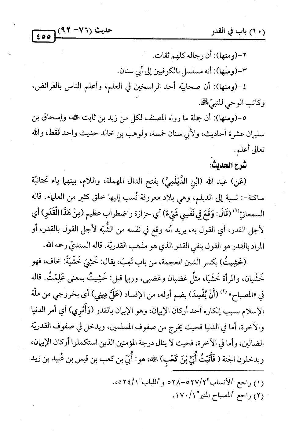(خَشِيتُ) بكسر الشين المعجمة، من باب تَعِبَ، يقال: خَشِيَ خَشْيَةً: خاف، فهو خَشْيان، والمرأة خَشْيَا، مثلُ غضبان وغضبى، وربما قيل: خَشِيتُ بمعنى عَلِمْتُ. قاله في "المصباح" (¬2) (أَنْ يُفْسِدَ) بضم أوله، من الإفساد (عَلَيَّ دِينِي) أي بخروجي من ملّة الإسلام بسبب إنكاره أحد أركان الإيمان، وهو الإيمان بالقدر (وَأَمْرِي) أي أمر الدنيا والآخرة، أما في الدنيا فحيث يخرج من صفوف المسلمين، ويدخل في صفوف القدريّة الضالين، وأما في الآخرة، فحيث لا ينال درجة المؤمنين الذين استكملوا أركان الإيمان، ويدخلون الجنة (فَأَتَيْتُ أُبَيَّ بْنَ كَعْبٍ) -رضي الله عنه-، هو: أُبَيّ بن كعب بن قيس بن عُبيد بن زيد