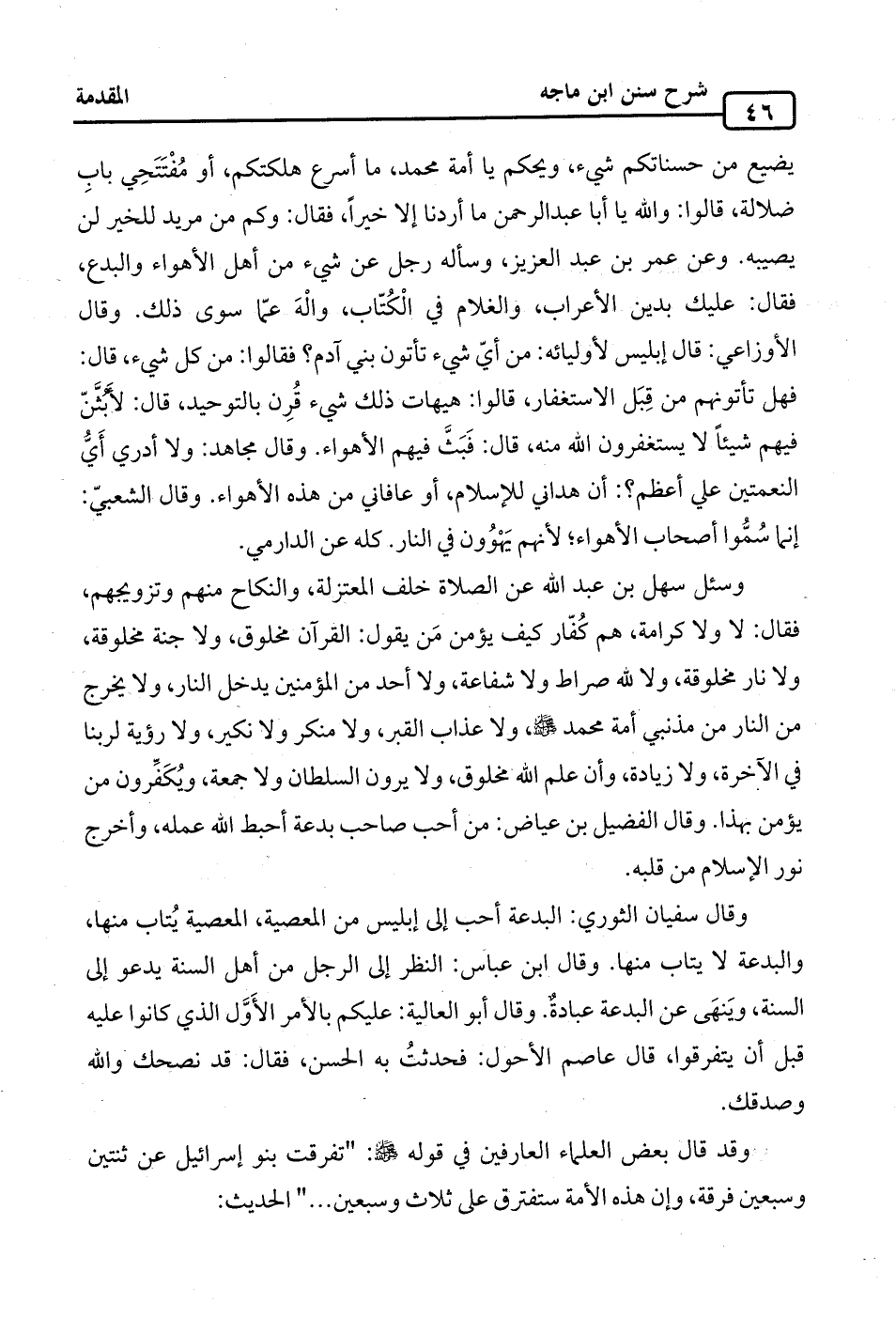 وقال سفيان الثوري: البدعة أحب إلى إبليس من المعصية، المعصية يُتاب منها، والبدعة لا يتاب منها. وقال ابن عباس: النظر إلى الرجل من أهل السنة يدعو إلى السنة، ويَنهَى عن البدعة عبادةٌ. وقال أبو العالية: عليكم بالأمر الأَوَّل الذي كانوا عليه قبل أن يتفرقوا، قال عاصم الأحول: فحدثتُ به الحسن، فقال: قد نصحك والله وصدقك.
