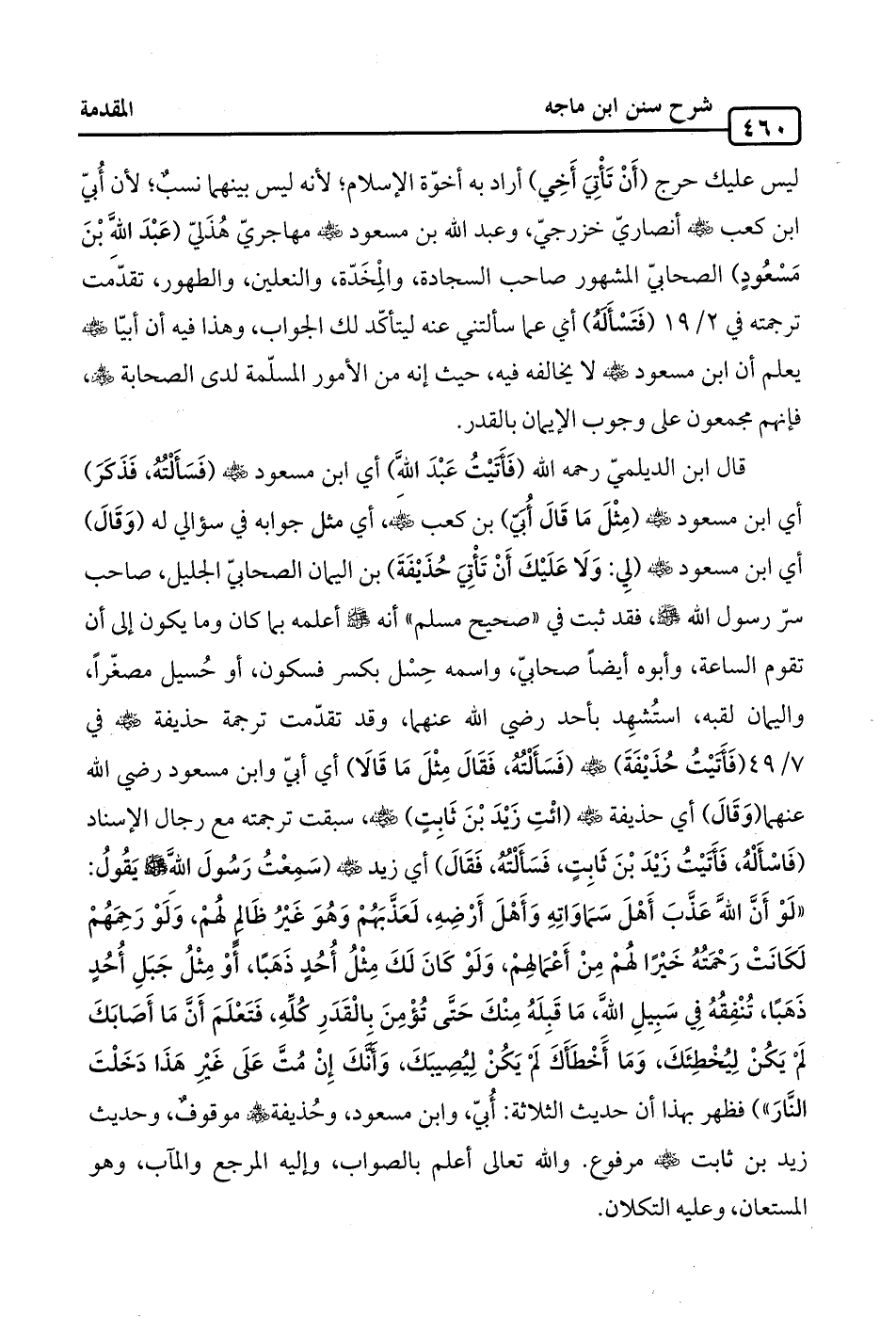 ليس عليك حرج (أَنْ تَأْتِيَ أَخِي) أراد به أخوّة الإسلام؛ لأنه ليس بينهما نسبٌ؛ لأن أُبيّ ابن كعب -رضي الله عنه- أنصاريّ خزرجيّ، وعبد الله بن مسعود -رضي الله عنه- مهاجريّ هُذَليّ (عَبْدَ اللَّهَ بْنَ مَسْعُودٍ) الصحابيّ المشهور صاحب السجادة، والمِخَدّة، والنعلين، والطهور، تقدّمَت ترجمته في 2/ 19 (فَتَسْأَلَهُ) أي عما سألتني عنه ليتأكّد لك الجواب، وهذا فيه أن أبيّا -رضي الله عنه- يعلم أن ابن مسعود -رضي الله عنه- لا يخالفه فيه، حيث إنه من الأمور المسلّمة لدى الصحابة -رضي الله عنهم-، فإنهم مجمعون على وجوب الإيمان بالقدر.