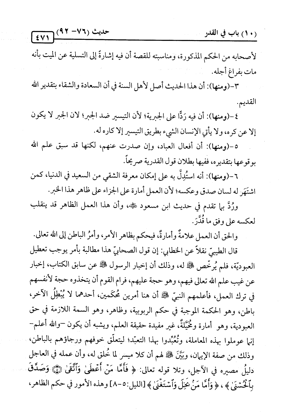 5 - (ومنها): أن أفعال العباد، وإن صدرت عنهم، لكنها قد سبق علم الله بوقوعها بتقديره، ففيها بطلان قول القدرية صريحًا.