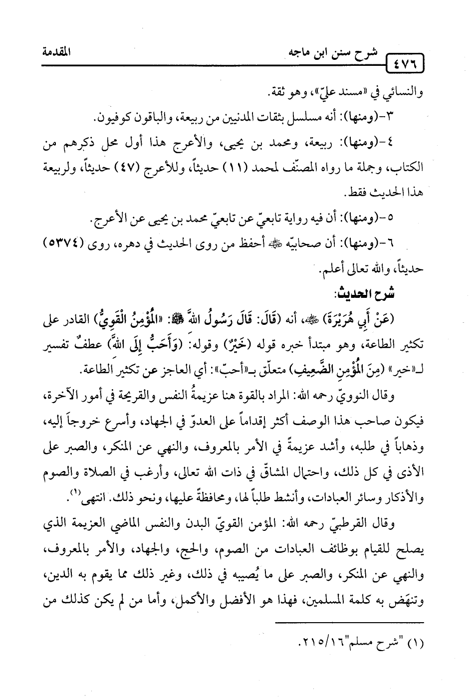 وقال النوويّ رحمه الله: المراد بالقوة هنا عزيمةُ النفس والقريحة في أمور الآخرة، فيكون صاحب هذا الوصف أكثر إقدامًا على العدوّ في الجهاد، وأسرع خروجًا إليه، وذهابًا في طلبه، وأشد عزيمةً في الأمر بالمعروف، والنهي عن المنكر، والصبر على الأذى في كل ذلك، واحتمال المشاقّ في ذات الله تعالى، وأرغب في الصلاة والصوم والأذكار وسائر العبادات، وأنشط طلبًا لها، ومحافظةً عليها، ونحو ذلك. انتهى (¬1).