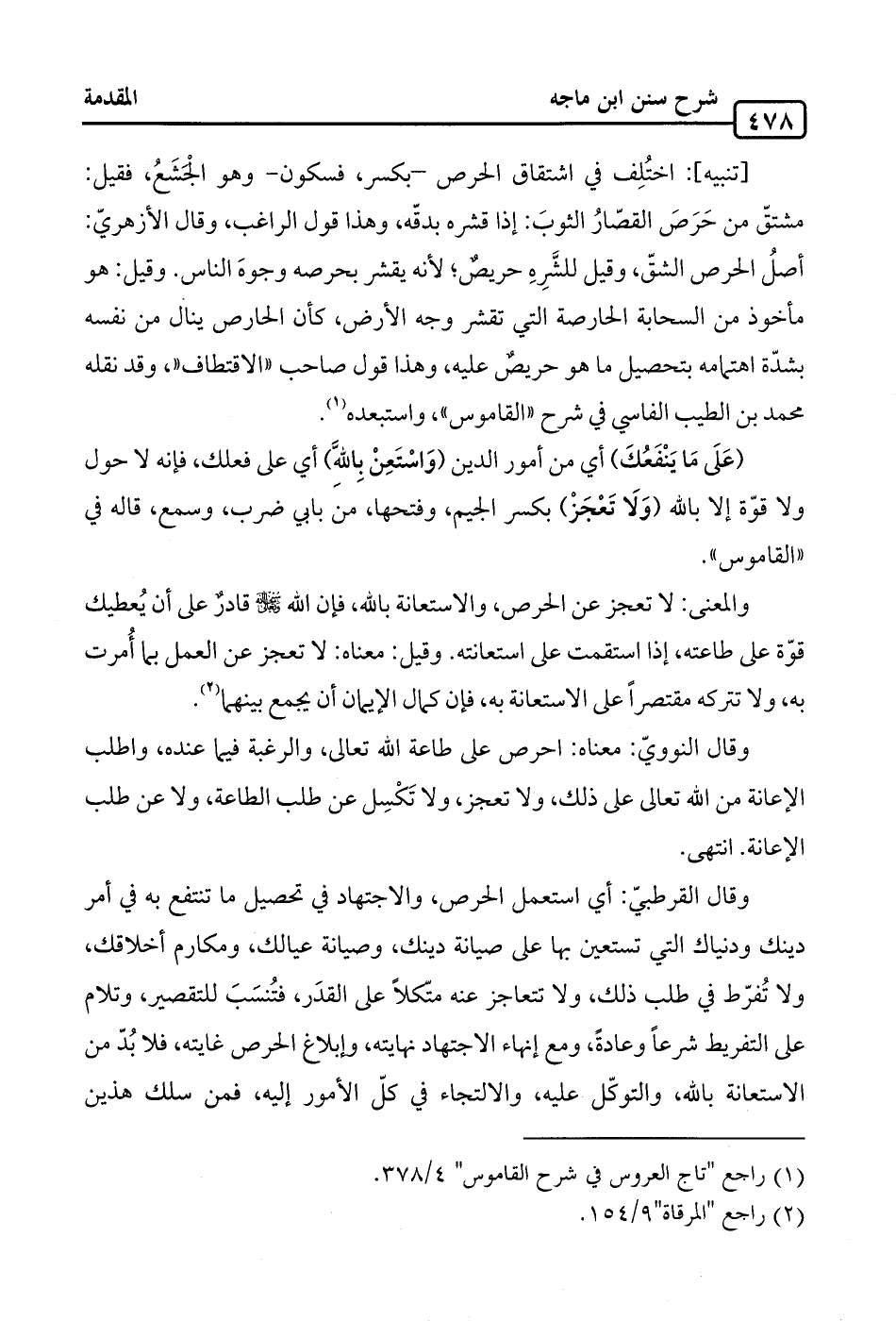 وقال القرطبيّ: أي استعمل الحرص، والاجتهاد في تحصيل ما تنتفع به في أمر دينك ودنياك التي تستعين بها على صيانة دينك، وصيانة عيالك، ومكارم أخلاقك، ولا تُفرّط في طلب ذلك، ولا تتعاجز عنه متّكلًا على القدَر، فتُنسَبَ للتقصير، وتلام على التفريط شرعًا وعادةً، ومع إنهاء الاجتهاد نهايته، وإبلاع الحرص غايته، فلا بُدّ من الاستعانة بالله، والتوكّل عليه، والالتجاء في كلّ الأمور إليه، فمن سلك هذين