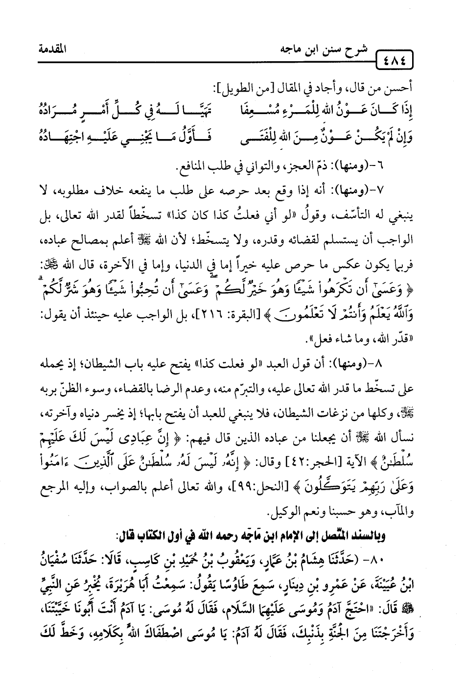 80 - (حَدَّثَنَا هِشَامُ بْنُ عَمَّارٍ، وَيَعْقُوبُ بْنُ حُمَيْدِ بْنِ كَاسِبٍ، قَالَا: حَدَّثَنَا سُفْيَانُ ابْنُ عُيَيْنَةَ، عَنْ عَمْرِو بْنِ دِينَارٍ، سَمِعَ طَاوُسًا يَقُولُ: سَمِعْتُ أَبَا هُرَيْرَةَ، يُخْبِرُ عَنِ النَّبِيِّ -صلى الله عليه وسلم- قَالَ: "احْتَجَّ آدَمُ وَمُوسَى عَلَيْهِمَا السَّلَام، فَقَالَ لَهُ مُوسَى: يَا آدَمُ انتَ أَبُونَا خَيَّبْتَنَا، وَأَخْرَجْتَنَا مِنَ الجنَّةِ بِذَنْبِكَ، فَقَالَ لَهُ آدَمُ: يَا مُوسَى اصْطَفَاكَ اللَّه بِكَلَامِهِ، وَخَطَّ لَكَ