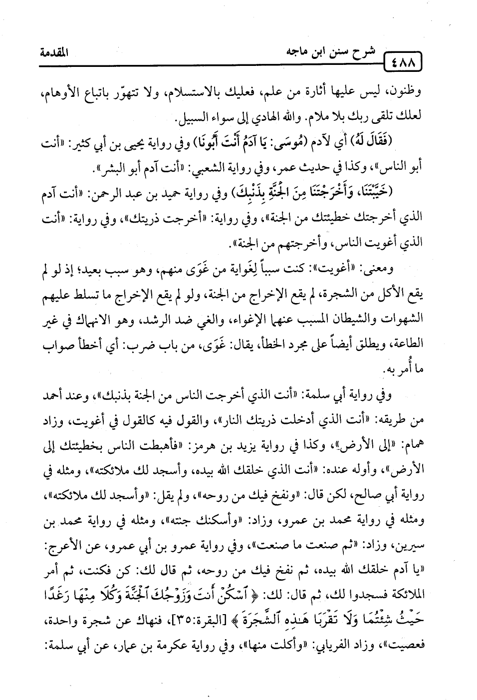 وفي رواية أبي سلمة: "أنت الذي أخرجت الناس من الجنة بذنبك"، وعند أحمد من طريقه: "أنت الذي أدخلت ذريتك النار"، والقول فيه كالقول في أغويت، وزاد همام: "إلى الأرض"، وكذا في رواية يزيد بن هرمز: "فأهبطت الناس بخطيئتك إلى الأرض"، وأوله عنده: "أنت الذي خلقك الله بيده، وأسجد لك ملائكته"، ومثله في رواية أبي صالح، لكن قال: "ونفخ فيك من روحه"، ولم يقل: "وأسجد لك ملائكته"، ومثله في رواية محمد بن عمرو، وزاد: "وأسكنك جنته"، ومثله في رواية محمد بن سيرين، وزاد: "ثم صنعت ما صنعت"، وفي رواية عمرو بن أبي عمرو، عن الأعرج: "يا آدم خلقك الله بيده، ثم نفخ فيك من روحه، ثم قال لك: كن فكنت، ثم أمر الملائكة فسجدوا لك، ثم قال: لك: {اسْكُنْ أَنْتَ وَزَوْجُكَ الْجَنَّةَ وَكُلَا مِنْهَا رَغَدًا حَيْثُ شِئْتُمَا وَلَا تَقْرَبَا هَذِهِ الشَّجَرَةَ} [البقرة: 35]، فنهاك عن شجرة واحدة، فعصيت"، وزاد الفريابي: "وأكلت منها"، وفي رواية عكرمة بن عمار، عن أبي سلمة: