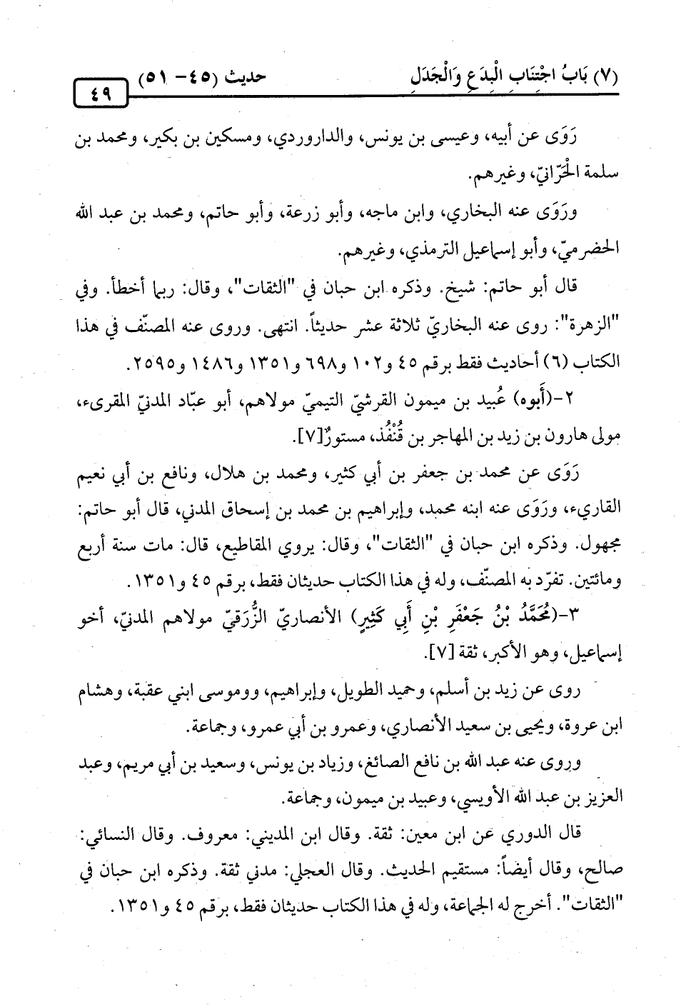 قال أبو حاتم: شيخ. وذكره ابن حبان في "الثقات"، وقال: ربما أخطأ. وفي "الزهرة": روى عنه البخاريّ ثلاثة عشر حديثًا. انتهى. وروى عنه المصنّف في هذا الكتاب (6) أحاديث فقط برقم 45 و102 و698 و1351 و1486 و2595.
