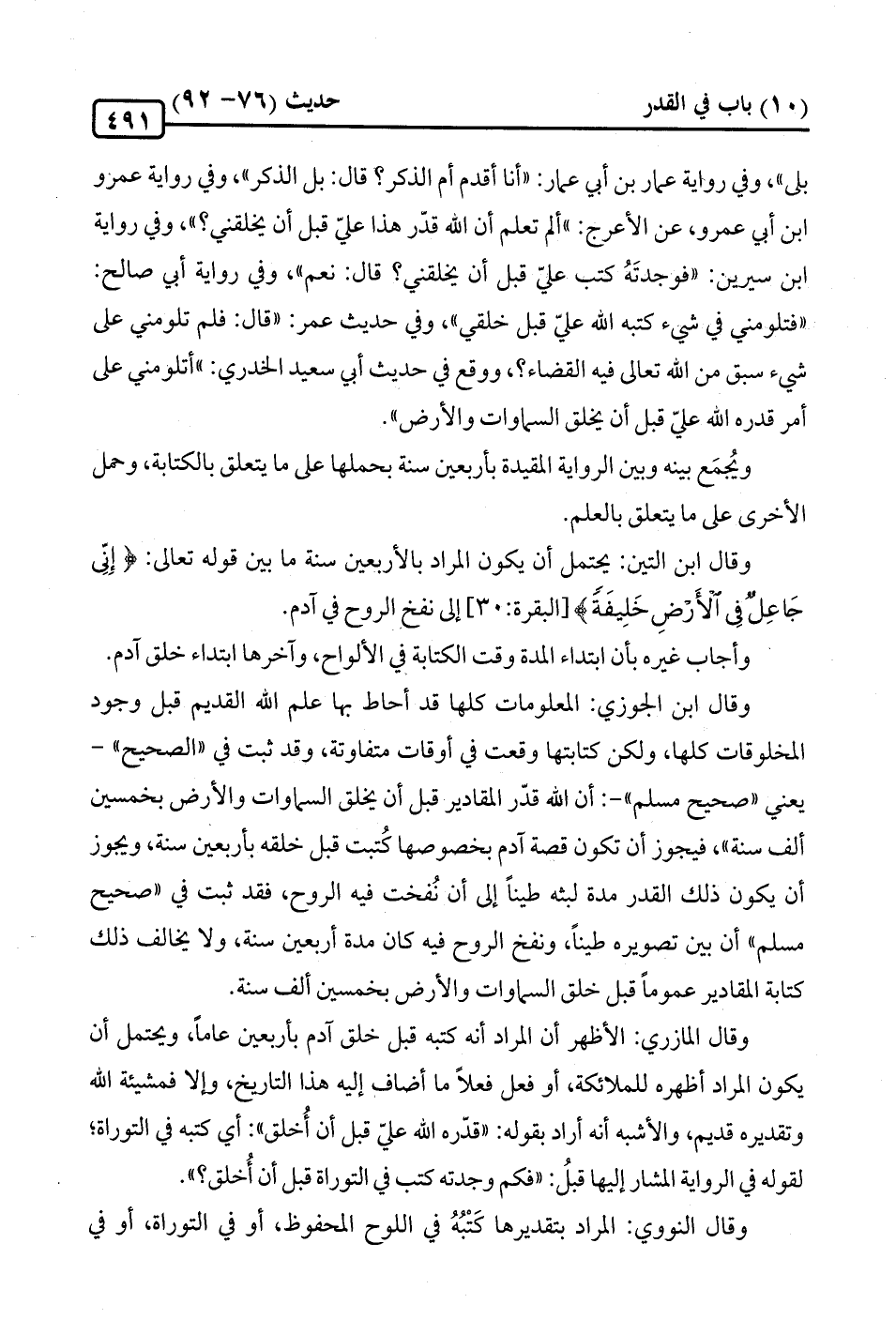 وقال المازري: الأظهر أن المراد أنه كتبه قبل خلق آدم بأربعين عامًا، ويحتمل أن يكون المراد أظهره للملائكة، أو فعل فعلًا ما أضاف إليه هذا التاريخ، وإلا فمشيئة الله وتقديره قديم، والأشبه أنه أراد بقوله: "قدّره الله عليّ قبل أن أُخلق": أي كتبه في التوراة؟ لقوله في الرواية المشار إليها قبلُ: "فكم وجدته كتب في التوراة قبل أن أُخلق؟ ".