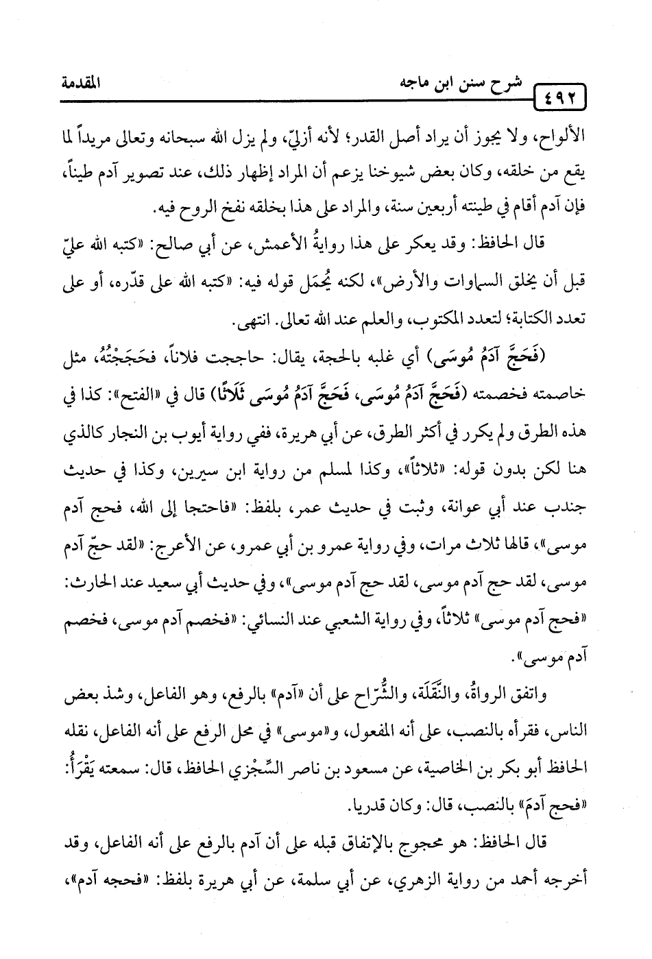 واتفق الرواةُ، والنَّقَلَة، والشُّرّاح على أن "آدم" بالرفع، وهو الفاعل، وشذ بعض الناس، فقرأه بالنصب، على أنه المفعول، و"موسى" في محل الرفع على أنه الفاعل، نقله الحافظ أبو بكر بن الخاصية، عن مسعود بن ناصر السِّجْزي الحافظ، قال: سمعته يَقْرَأُ: "فحج آدمَ" بالنصب، قال: وكان قدريا.