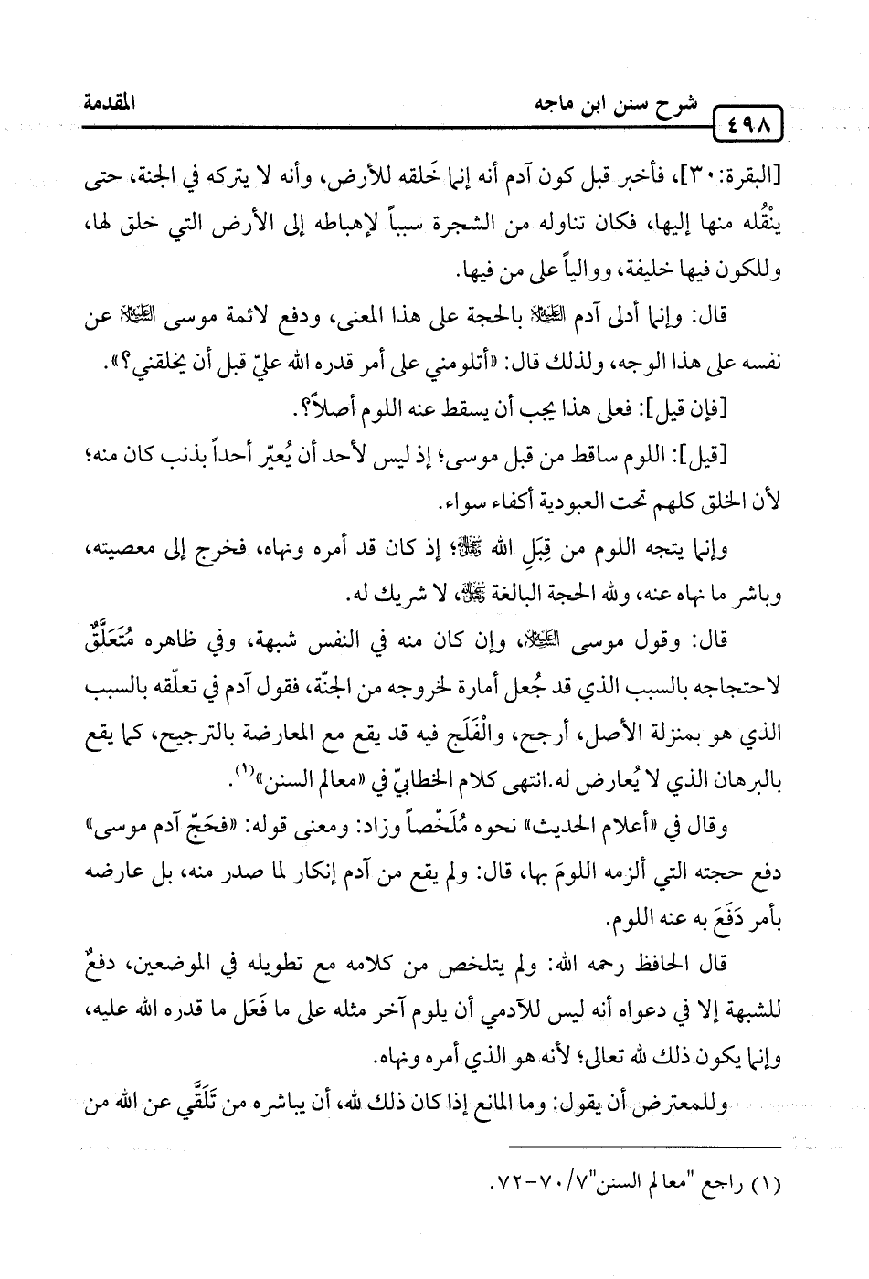 قال: وقول موسى عليه السلام، وإن كان منه في النفس شبهة، وفي ظاهره مُتَعَلَّقٌ لاحتجاجه بالسبب الذي قد جُعل أمارة لخروجه من الجنّة، فقول آدم في تعلّقه بالسبب الذي هو بمنزلة الأصل، أرجح، والْفَلَج فيه قد يقع مع المعارضة بالترجيح، كما يقع بالبرهان الذي لا يُعارض له. انتهى كلام الخطابيّ في "معالم السنن" (¬1).