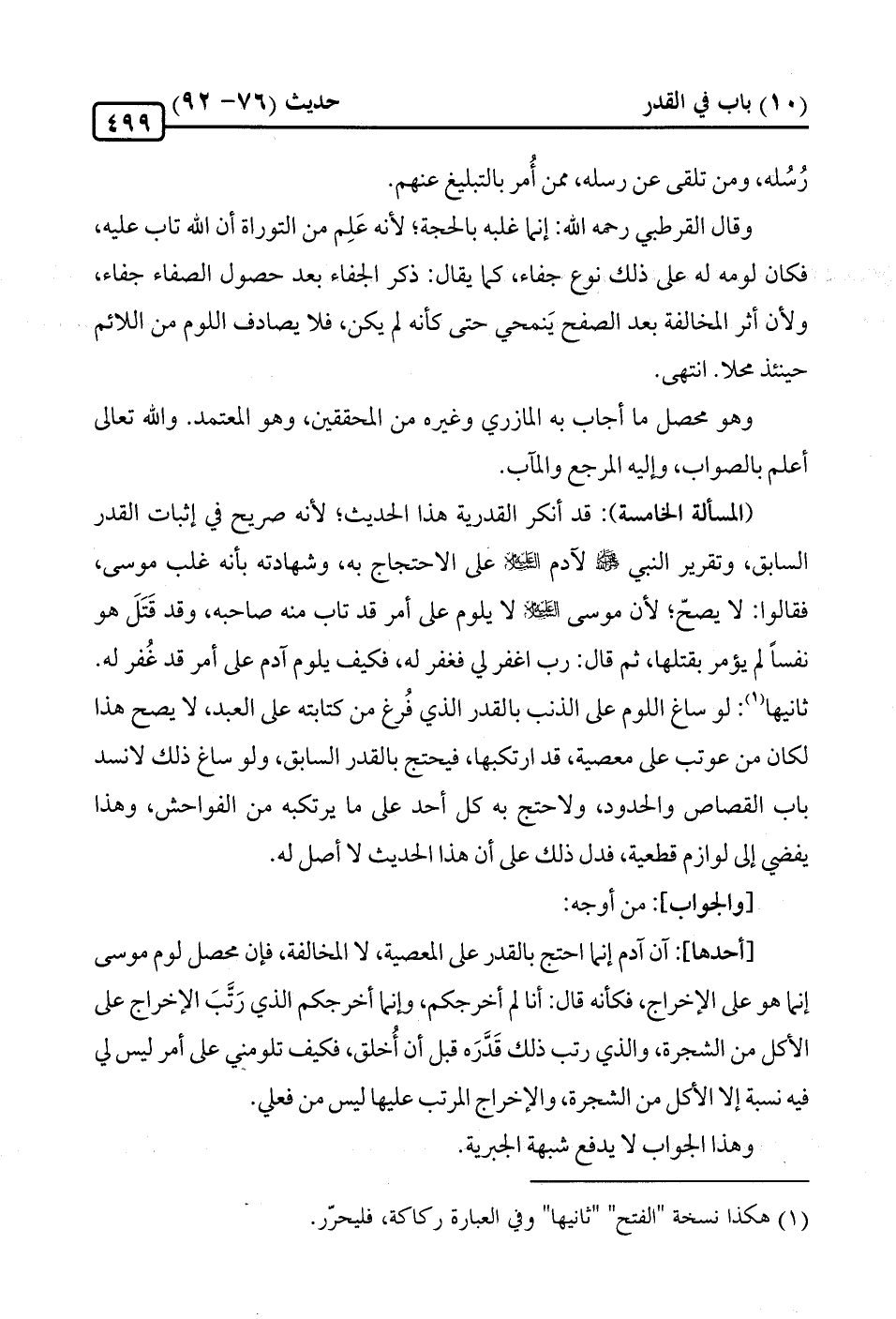 (المسألة الخامسة): قد أنكر القدرية هذا الحديث؛ لأنه صريح في إثبات القدر السابق، وتقرير النبي -صلى الله عليه وسلم- لآدم عليه السلام على الاحتجاج به، وشهادته بأنه غلب موسى، فقالوا: لا يصحّ؛ لأن موسى عليه السلام لا يلوم على أمر قد تاب منه صاحبه، وقد قَتَلَ هو نفسًا لم يؤمر بقتلها، ثم قال: رب اغفر لي فغفر له، فكيف يلوم آدم على أمر قد غُفر له.