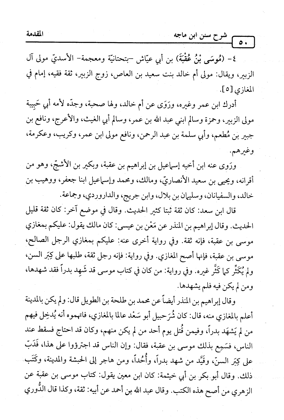 4 - (مُوسَى بْنُ عُقْبَةَ) بن أبي عيّاش -بتحتانيّة ومعجمة- الأسديّ مولى آل الزبير، ويقال: مولى أم خالد بنمت سعيد بن العاص، زوج الزبير، ثقة فقيه، إمام في المغازي [5].