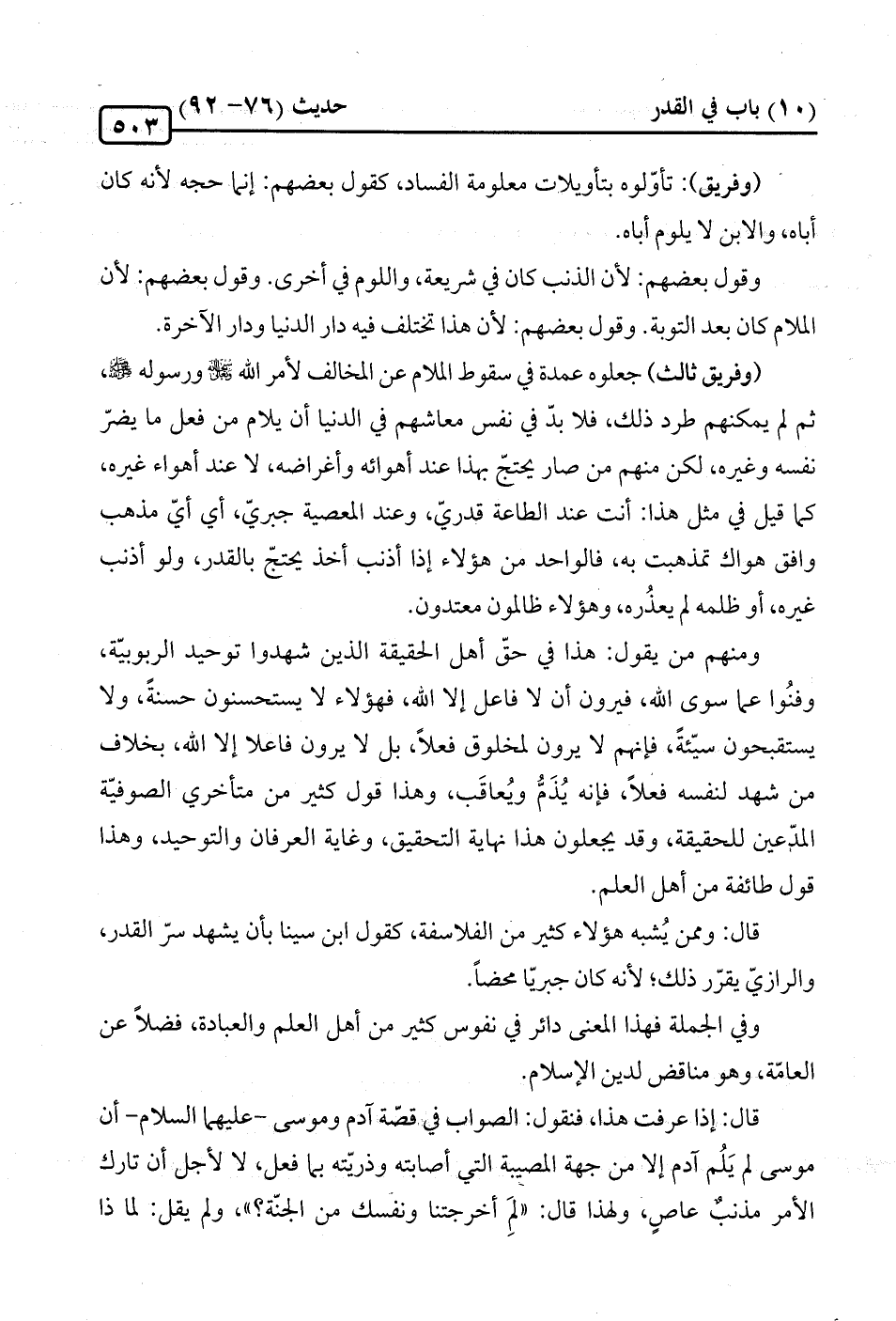 (وفريق ثالث) جعلوه عمدة سقوط الملام عن المخالف لأمر الله سبحانه وتعالي ورسوله -صلى الله عليه وسلم-، ثم لم يمكنهم طرد ذلك، فلا بدّ في نفس معاشهم في الدنيا أن يلام من فعل ما يضرّ نفسه وغيره، لكن منهم من صار يحتج بهذا عند أهوائه وأغراضه، لا عند أهواء غيره، كما قيل في مثل هذا: أنت عند الطاعة قدريّ، وعند المعصية جبريّ، أي أيّ مذهب وافق هواك تمذهبت به، فالواحد من هؤلاء إذا أذنب أخذ يحتجّ بالقدر، ولو أذنب غيره، أو ظلمه لم يعذُره، وهؤلاء ظالمون معتدون.