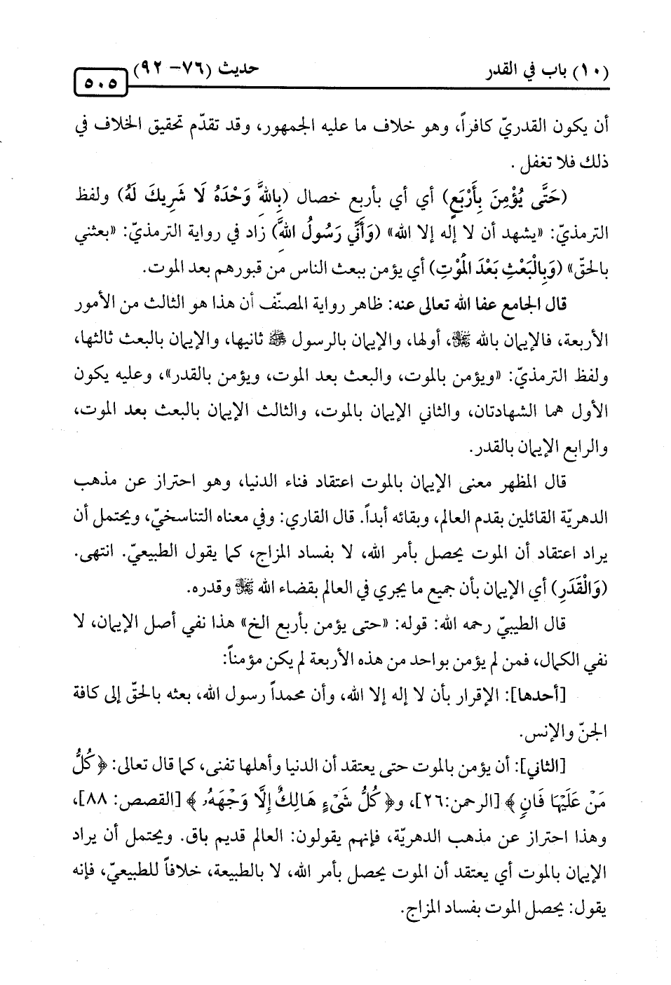 قال الطيبيّ رحمه الله: قوله: "حتى يؤمن بأربع الخ" هذا نفي أصل الإيمان، لا نفي الكمال، فمن لم يؤمن بواحد من هذه الأربعة لم يكن مؤمنًا: