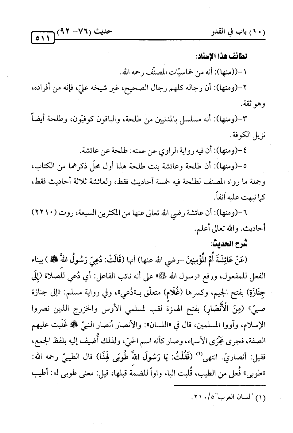 5 - (ومنها): أن طلحة وعائشة بنت طلحة هذا أول محلّ ذكرهما من الكتاب، وجملة ما رواه المصنف لطلحة فيه خمسة أحاديث فقط، ولعائشة ثلاثة أحاديث فقط، كما نبهت عليه آنفًا.