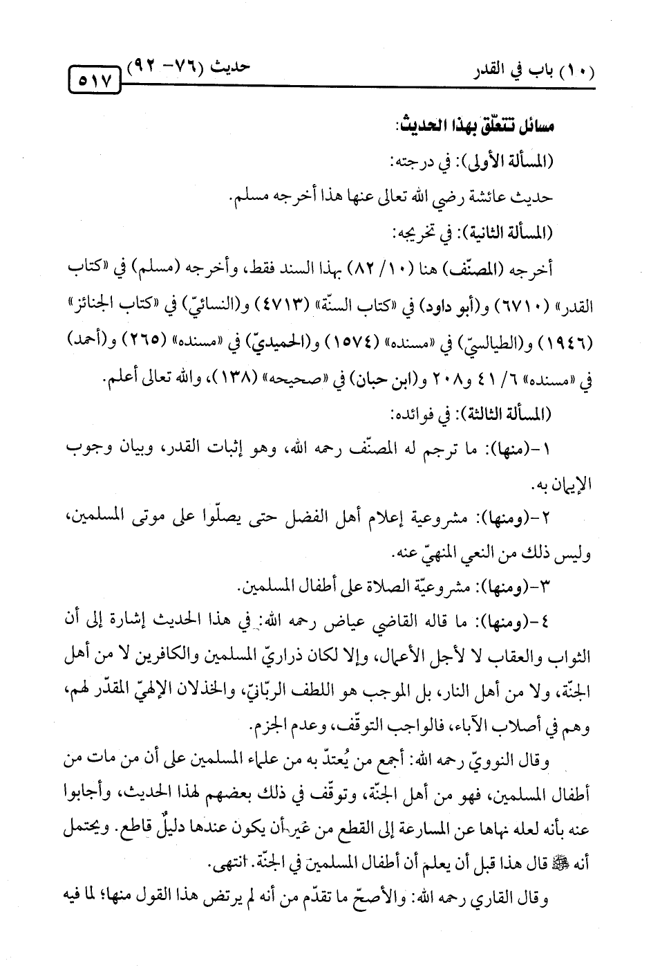 وقال النوويّ رحمه الله: أجمع من يُعتدّ به من علماء المسلمين على أن من مات من أطفال المسلمين، فهو من أهل الجنّة، وتوقّف في ذلك بعضهم لهذا الحديث، وأجابوا عنه بأنه لعله نهاها عن المسارعة إلى القطع من غير أن يكون عندها دليلٌ قاطع. ويحتمل أنه -صلى الله عليه وسلم- قال هذا قبل أن يعلم أن أطفال المسلمين في الجنّة. انتهى.