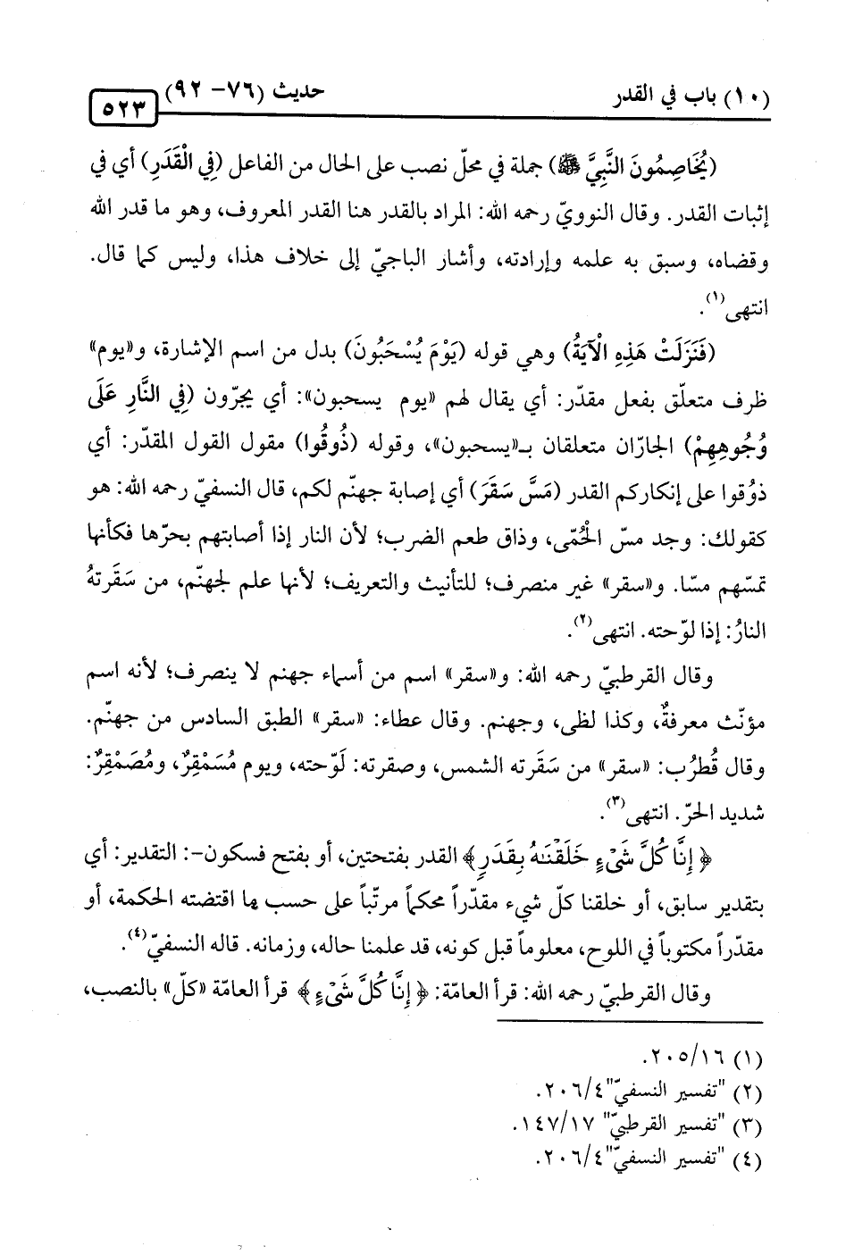 (يُخَاصِمُونَ النَّبِيَّ -صلى الله عليه وسلم-) جملة في محلّ نصب على الحال من الفاعل (في الْقَدَرِ) أي في إثبات القدر. وقال النوويّ رحمه الله: المراد بالقدر هنا القدر المعروف، وهو ما قدر الله وقضاه، وسبق به علمه وإرادته، وأشار الباجيّ إلى خلاف هذا، وليس كما قال. انتهى (¬1).