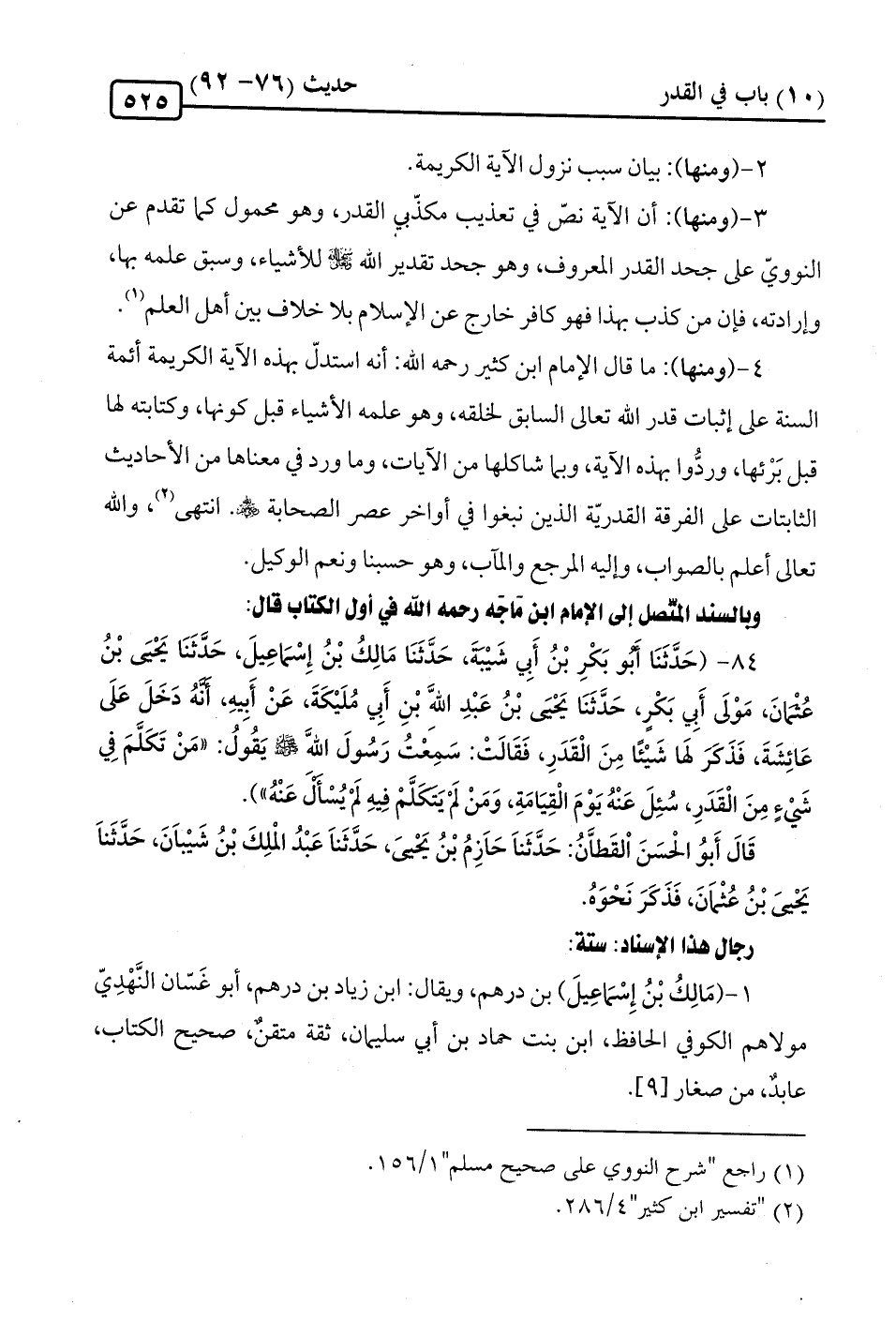 84 - (حَدَّثَنَا أبُو بَكْرِ بْنُ أَبِي شَيْبةَ، حَدَّثَنَا مَالِكُ بْنُ إِسْمَاعِيلَ، حَدَّثَنَا يَحْيىَ بْنُ عُثْمانَ، مَوْلَى أَبِي بَكْرٍ، حَدَّثَنَا يَحْيىَ بْنُ عَبْدِ الله بْنِ أَبِي مُلَيْكَةَ، عَنْ أَبِيهِ، أنهُ دَخَلَ عَلَى عَائِشَةَ، فَذَكَرَ لهَا شَيْئًا مِنَ الْقَدَرِ، فَقَالَتْ: سَمِعْتُ رَسُولَ الله -صلى الله عليه وسلم- يَقُولُ: "مَنْ تَكَلَّمَ في شَيْءٍ مِنَ الْقَدَرِ، سُئِلَ عَنْهُ يَوْمَ الْقِيَامَةِ، وَمَنْ لم يَتكَلَّمْ فِيهِ لم يُسْألَ عَنْهُ").