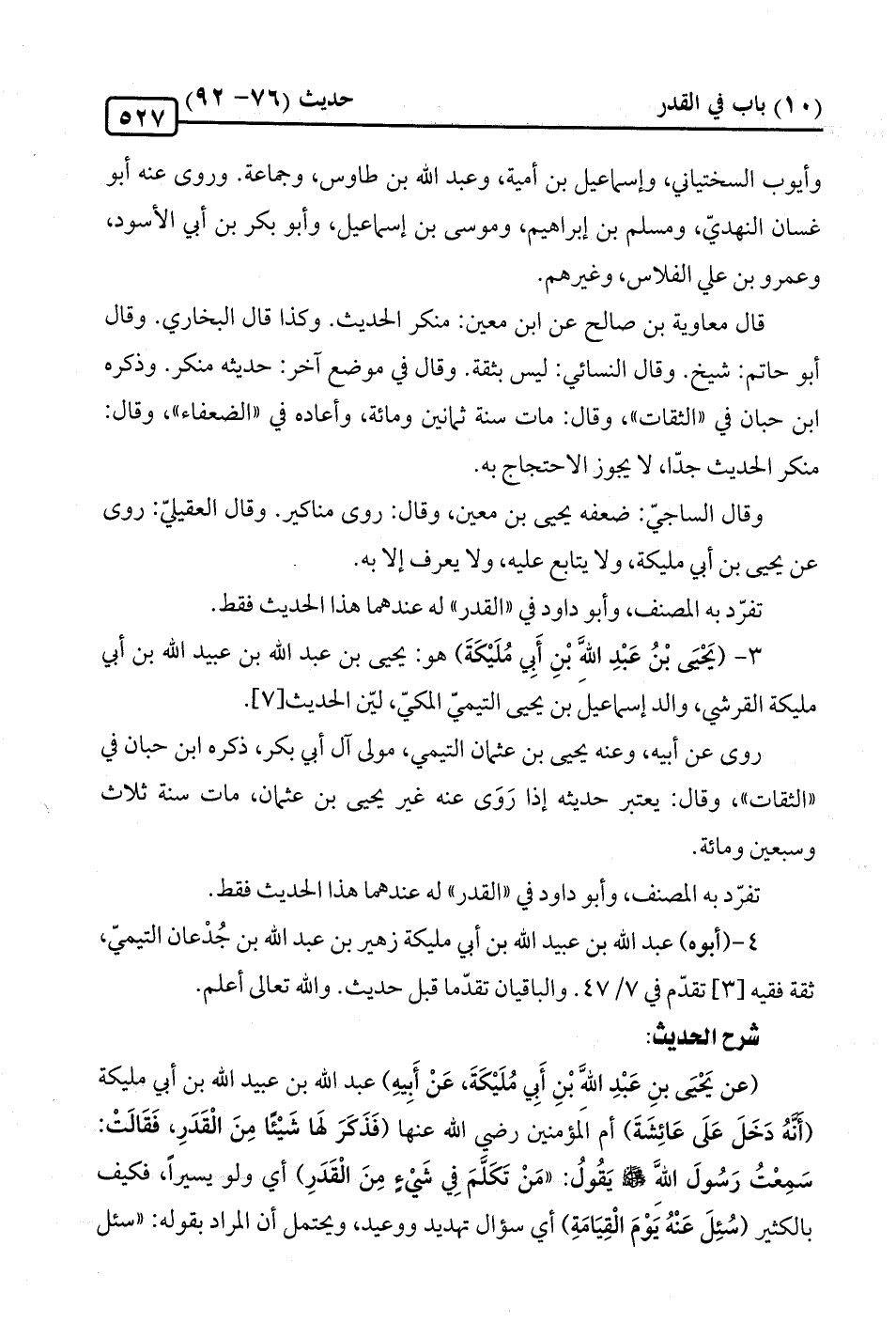 (عن يَحْيى بنِ عَبْدِ الله بْنِ أبي مُلَيْكَةَ، عَنْ أَبِيهِ) عبد الله بن عبيد الله بن أبي مليكة (أنَّهُ دَخَلَ عَلَى عَائِشَةَ) أم المؤمنين رضي الله عنها (فَذَكَرَ لهَا شَيْئًا مِنَ الْقَدَرِ، فَقَالَتْ: سَمِعْتُ رَسُولَ الله -صلى الله عليه وسلم- يَقُول: "مَنْ تَكَلَّمَ في شَيْءٍ مِنَ الْقَدَرِ) أي ولو يسيرًا، فكيف بالكثير (سُئِلَ عَنْهُ يَوْمَ الْقِيَامَةِ) أي سؤال تهديد ووعيد، ويحتمل أن المراد بقوله: "سئل