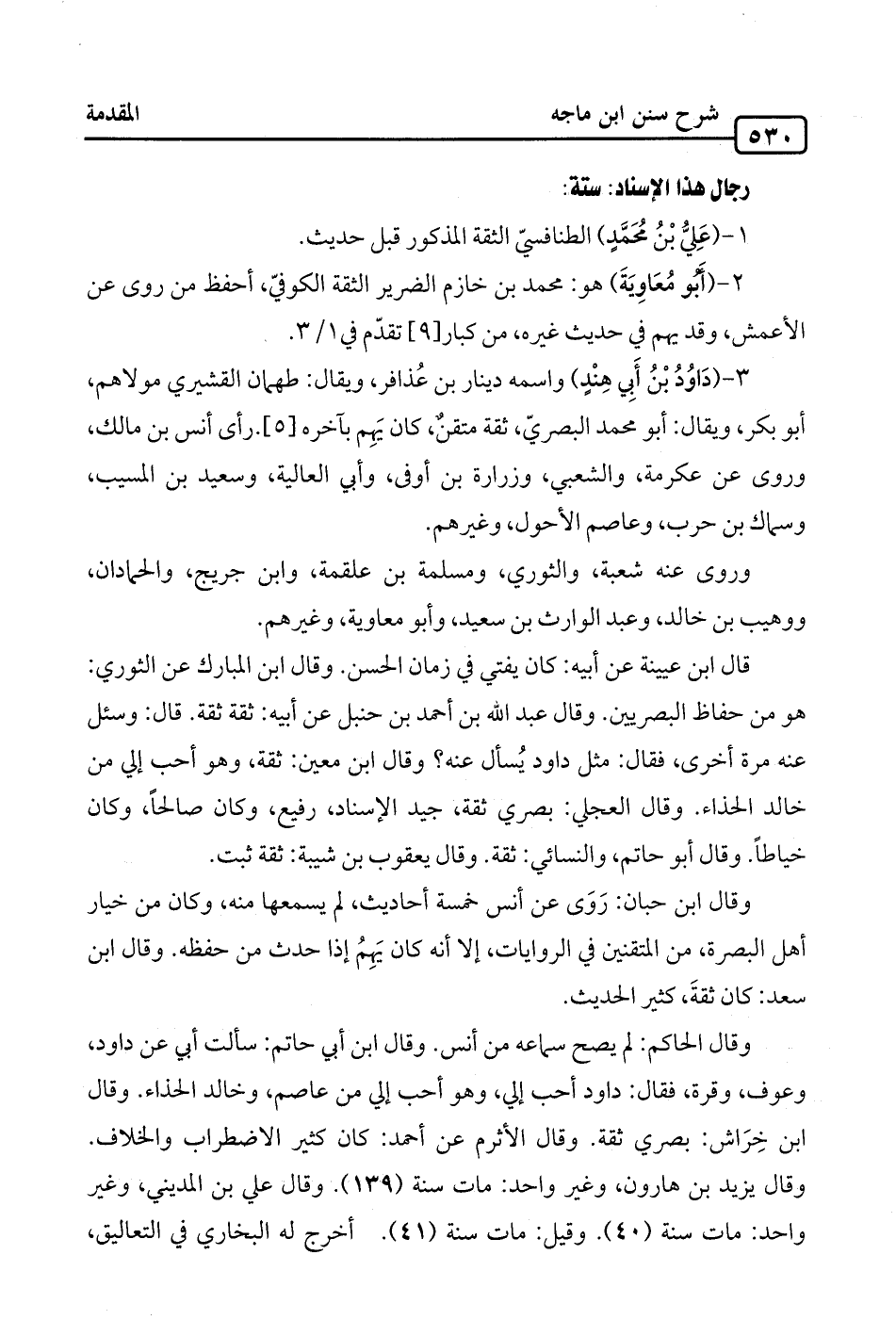3 - (دَاوُدُ بْنُ أَبِي هِنْدٍ) واسمه دينار بن عُذافر، ويقال: طهمان القشيري مولاهم، أبو بكر، ويقال: أبو محمد البصريّ، ثقة متقنٌ، كان يَهِم بآخره [5]. رأى أنس بن مالك، وروى عن عكرمة، والشعبي، وزرارة بن أوفى، وأبي العالية، وسعيد بن المسيب، وسماك بن حرب، وعاصم الأحول، وغيرهم.