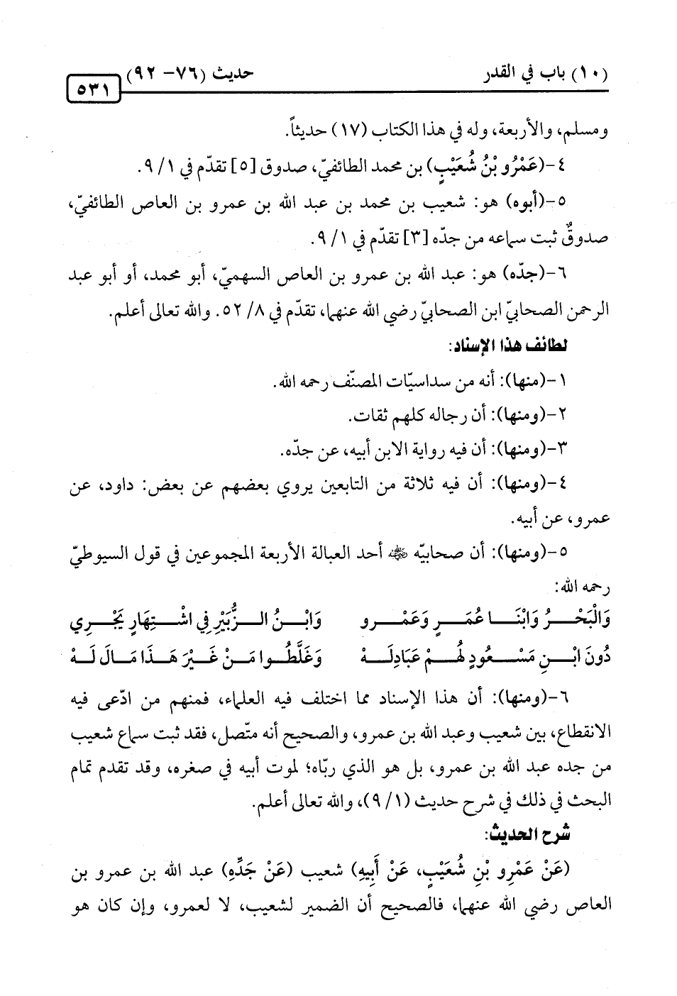 6 - (ومنها): أن هذا الإسناد مما اختلف فيه العلماء، فمنهم من ادّعى فيه الانقطاع، بين شعيب وعبد الله بن عمرو، والصحيح أنه متّصل، فقد ثبت سماع شعيب من جده عبد الله بن عمرو، بل هو الذي ربّاه؛ لموت أبيه في صغره، وقد تقدم تمام البحث في ذلك في شرح حديث (1/ 9)، والله تعالى أعلم.