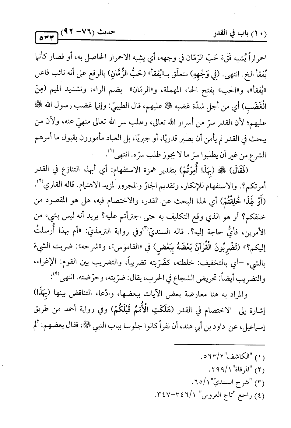 احمرارًا يُشبه فَقْءَ حَبّ الرّمّان في وجهه، أي يشبه الاحمرار الحاصل به، أو فصار كأنما يُفقأ الخ. انتهى. (فِيْ وَجْهِهِ) متعلّق بـ "يُفقأ" (حَبُّ الزُّمَّانِ) بالرفع على أنه نائب فاعل "يُفقأ"، و"الحب" بفتح الحاء المهملة، و"الرمّان" بضم الراء، وتشديد الميم (مِنَ الْغَضَبِ) أي من أجل شدّة غضبه -صلى الله عليه وسلم- عليهم، قال الطيبيّ: وإنما غضب رسول الله -صلى الله عليه وسلم- عليهم؛ لأن القدر سرّ من أسرار الله تعالى، وطلب سر الله تعالى منهيّ عنه، ولأن من يبحث في القدر لم يأمن أن يصير قدريّا، أو جبريّا، بل العباد مأمورون بقبول ما أمرهم الشرع من غير أن يطلبوا سرّ ما لا يجوز طلب سرّه. انتهى (¬1).