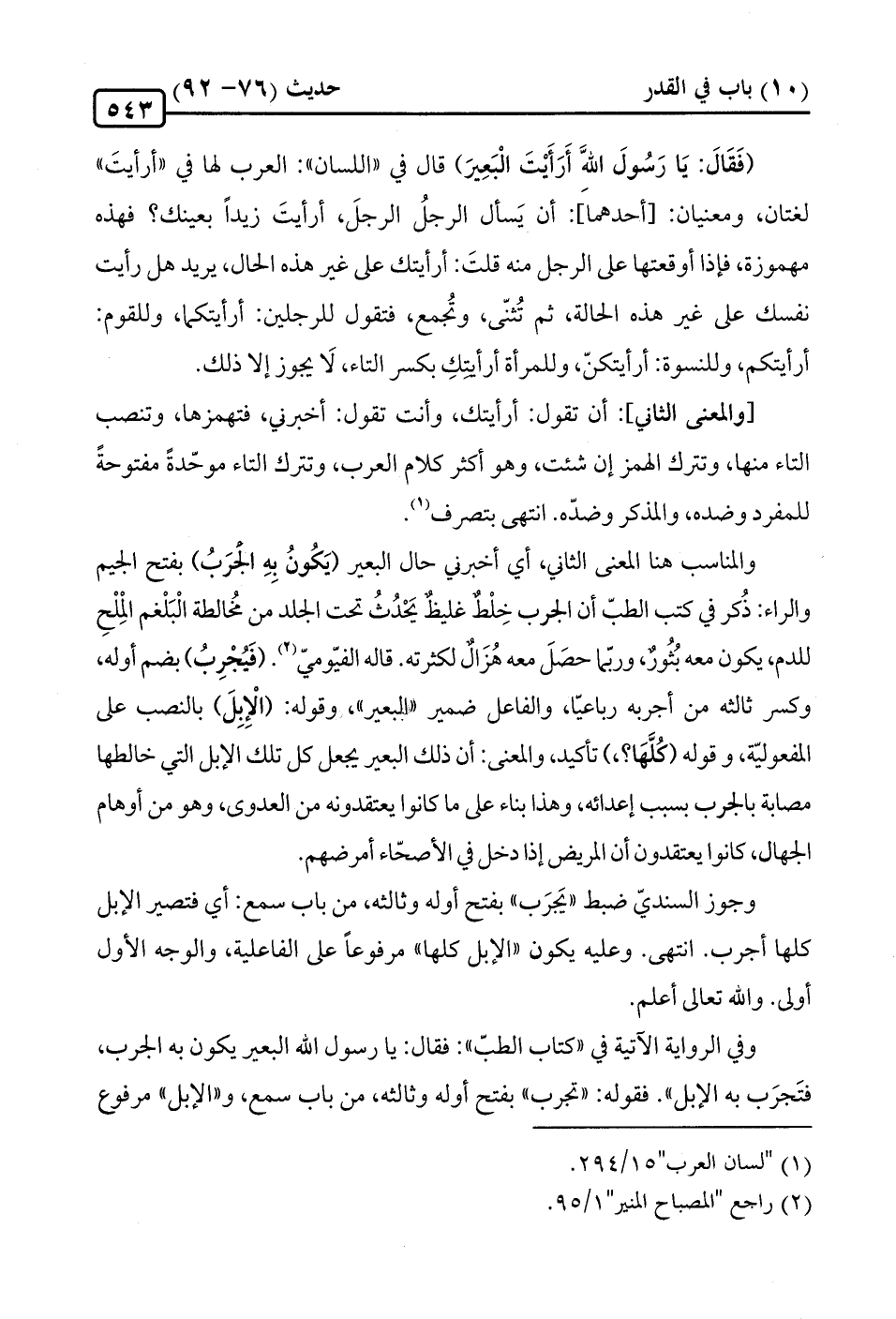 والمناسب هنا المعنى الثاني، أي أخبرني حال البعير (يَكُونُ بِهِ الجرَبُ) بفتح الجيم والراء: ذُكر في كتب الطبّ أن الجرب خِلْطٌ غليظٌ يَحْدُثُ تحت الجلد من مخُالطة الْبَلْغم المِلْحِ للدم، يكون معه بُثُورٌ، وربّما حصَلَ معه هُزَالٌ لكثرته. قاله الفيّوميّ (¬2). (فَيُجْرِبُ) بضم أوله، وكسر ثالثه من أجربه رباعيّا، والفاعل ضمير "البعير"، وقوله: (الإبِلَ) بالنصب على المفعوليّة، وقوله (كلَّهَا؟،) تأكيد، والمعنى: أن ذلك البعير يجعل كل تلك الإبل التي خالطها مصابة بالجرب بسبب إعدائه، وهذا بناء على ما كانوا يعتقدونه من العدوى، وهو من أوهام الجهال، كانوا يعتقدون أن المريض إذا دخل في الأصحّاء أمرضهم.