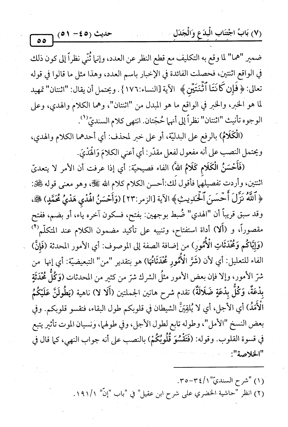 ضمير "هما" لما وقع به التكليف مع قطع النظر عن العدد، وإنما ثُنّي نظرًا إلى كون ذلك في الواقع اثنتين، فحصلت الفائدة في الإخبار باسم العدد، وهذا مثل ما قالوا في قوله تعالى: {فَإِنْ كَانَتَا اثْنَتَيْنِ} الآية [النساء: 176]. ويحتمل أن يقال: "اثنتان" تمهيد لما هو الخبر، والخبر في الواقع ما هو المبدل من "اثنتان"، وهما الكلام والهدي، وعلى الوجوه تأنيث "اثنتان" نظرًا إلى أنهما حُجّتان. انتهى كلام السنديّ (¬1).