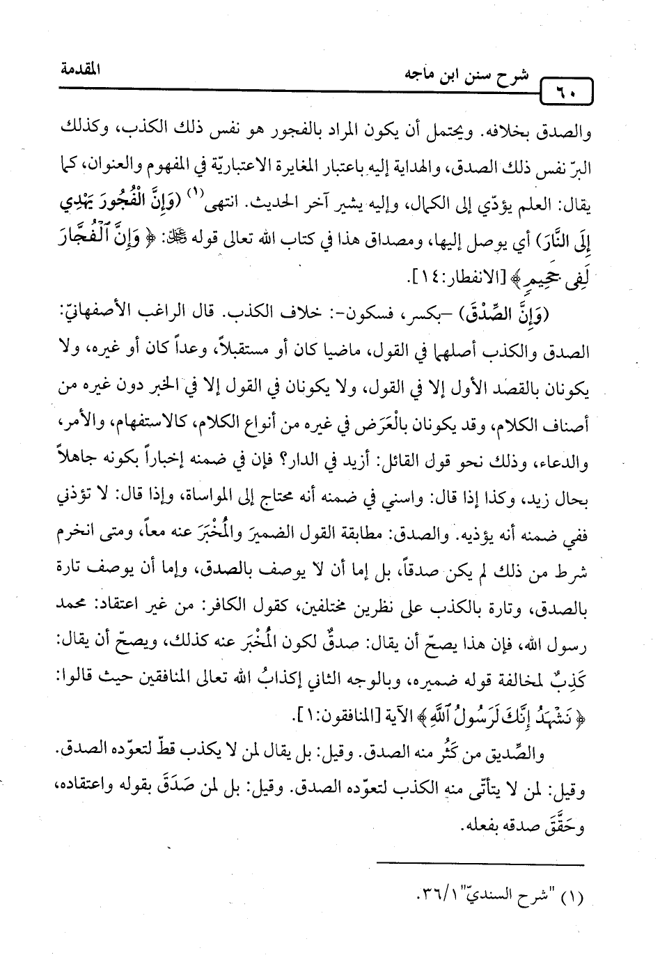 (وَإِنَّ الصِّدْقَ) -بكسر، فسكون-: خلاف الكذب. قال الراغب الأصفهانيّ: الصدق والكذب أصلهما في القول، ماضيا كان أو مستقبلًا، وعدًا كان أو غيره، ولا يكونان بالقصد الأول إلا في القول، ولا يكونان في القول إلا في الخبر دون غيره من أصناف الكلام، وقد يكونان بالْعَرَض في غيره من أنواع الكلام، كالاستفهام، والأمر، والدعاء، وذلك نحو قول القائل: أزيد في الدار؟ فإن في ضمنه إخبارًا بكونه جاهلًا بحال زيد، وكذا إذا قال: واسني في ضمنه أنه محتاج إلى المواساة، وإذا قال: لا تؤذني ففي ضمنه أنه يؤذيه. والصدق: مطابقة القول الضميرَ والمُخْبَرَ عنه معًا، ومتى انخرم شرط من ذلك لم يكن صدقًا، بل إما أن لا يوصف بالصدق، وإما أن يوصف تارة بالصدق، وتارة بالكذب على نظرين مختلفين، كقول الكافر: من غير اعتقاد: محمد رسول الله، فإن هذا يصحّ أن يقال: صدقٌ لكون المُخْبَر عنه كذلك، ويصحّ أن يقال: كَذِبٌ لمخالفة قوله ضميره، وبالوجه الثاني إكذابُ الله تعالى المنافقين حيث قالوا: {نَشْهَدُ إِنَّكَ لَرَسُولُ اللَّهِ} الآية [المنافقون: 1].