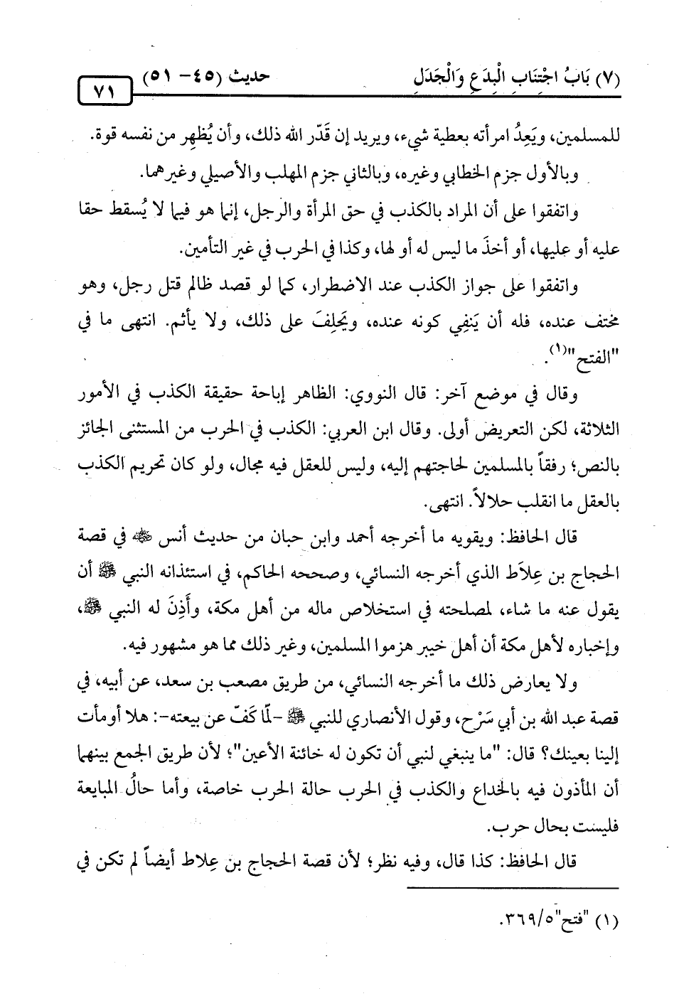 وقال في موضع آخر: قال النووي: الظاهر إباحة حقيقة الكذب في الأمور الثلاثة، لكن التعريض أولى. وقال ابن العربي: الكذب في الحرب من المستثنى الجائز بالنص؛ رفقًا بالمسلمين لحاجتهم إليه، وليس للعقل فيه مجال، ولو كان تحريم الكذب بالعقل ما انقلب حلالًا. انتهى.