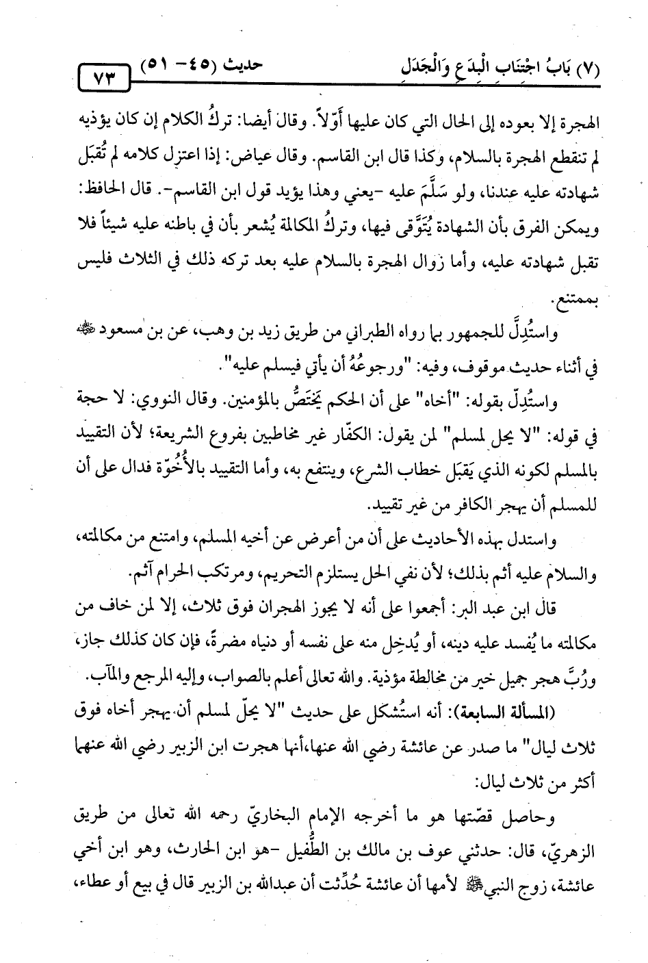 (المسألة السابعة): أنه استُشكل على حديث "لا يحلّ لمسلم أن يهجر أخاه فوق ثلاث ليال" ما صدر عن عائشة رضي الله عنها، أنها هجرت ابن الزبير رضي الله عنهما أكثر من ثلاث ليال: